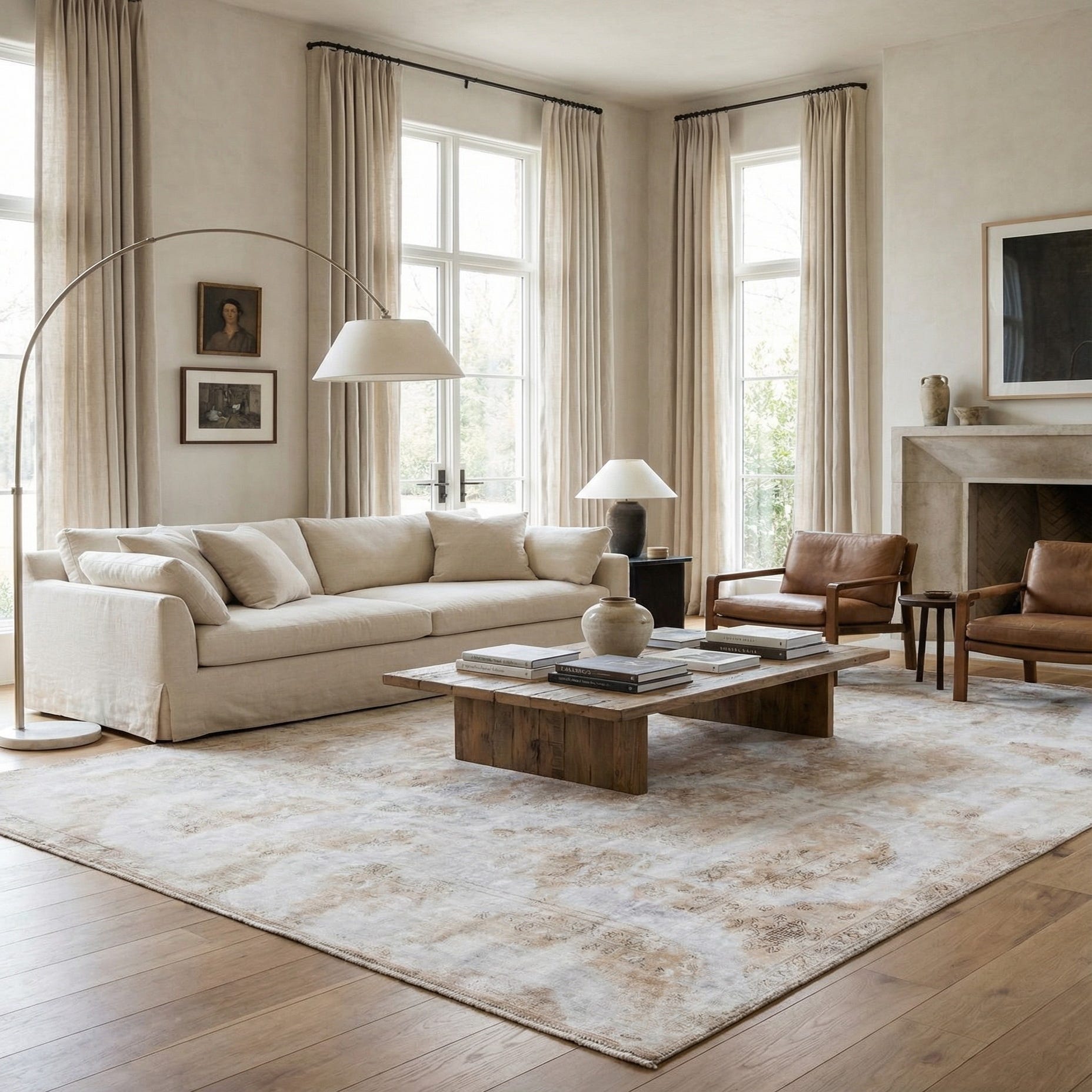 Primary color is Khaki. Colors in this rug include: Khaki, Brown, Ivory.