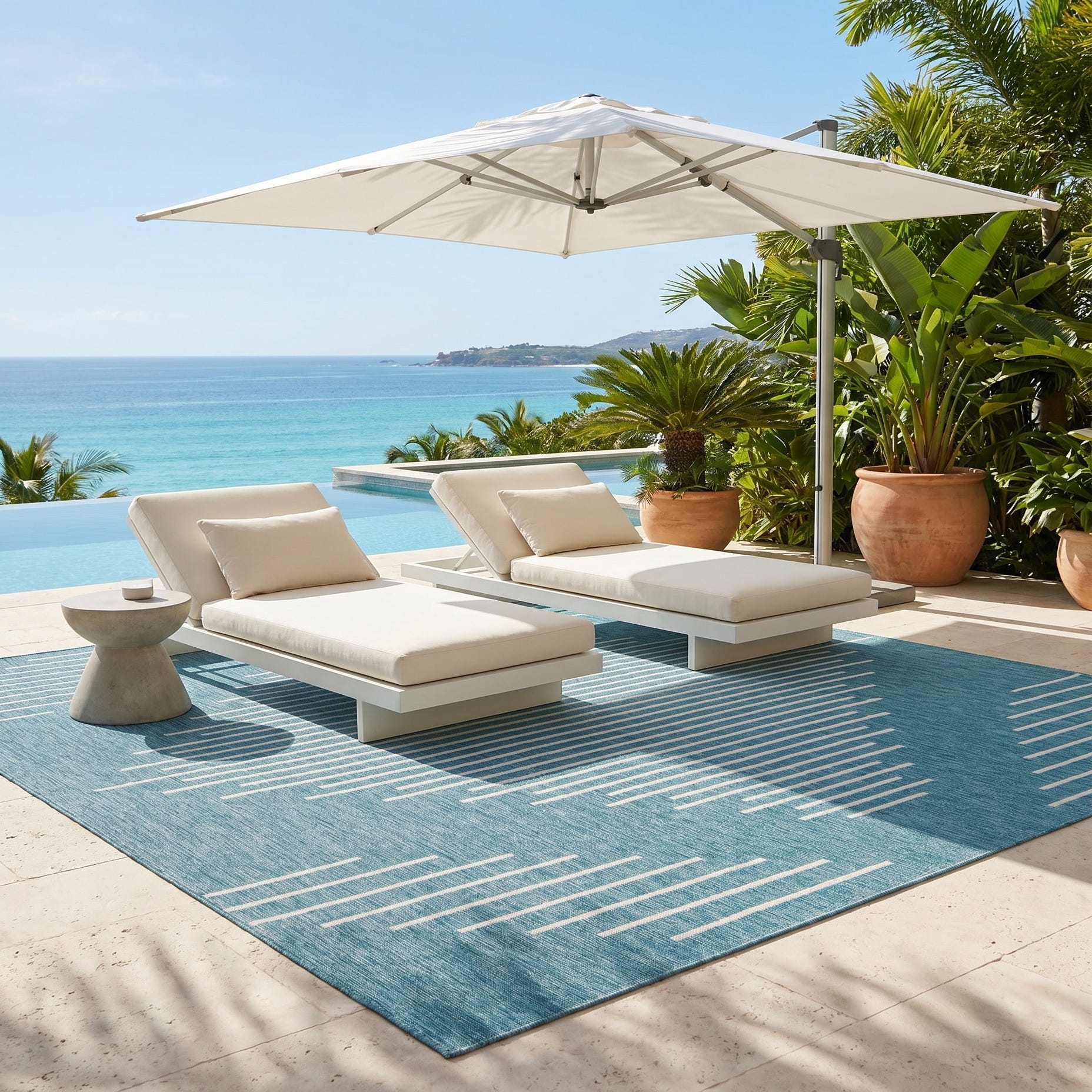 Love the contemporary look of this rug! We are so happy we chose this to accent the blue of our pool with our living area on our lanai. We still are going to add a few more pillows but love the rug to add color.