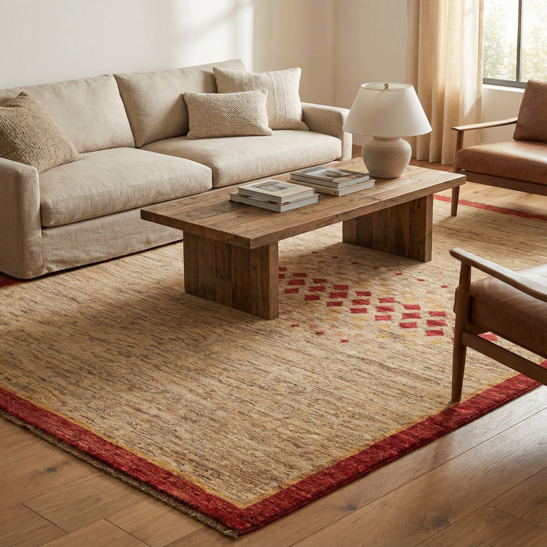Primary color is Light Beige. Colors in this rug include: Light Beige, Red, Yellow.