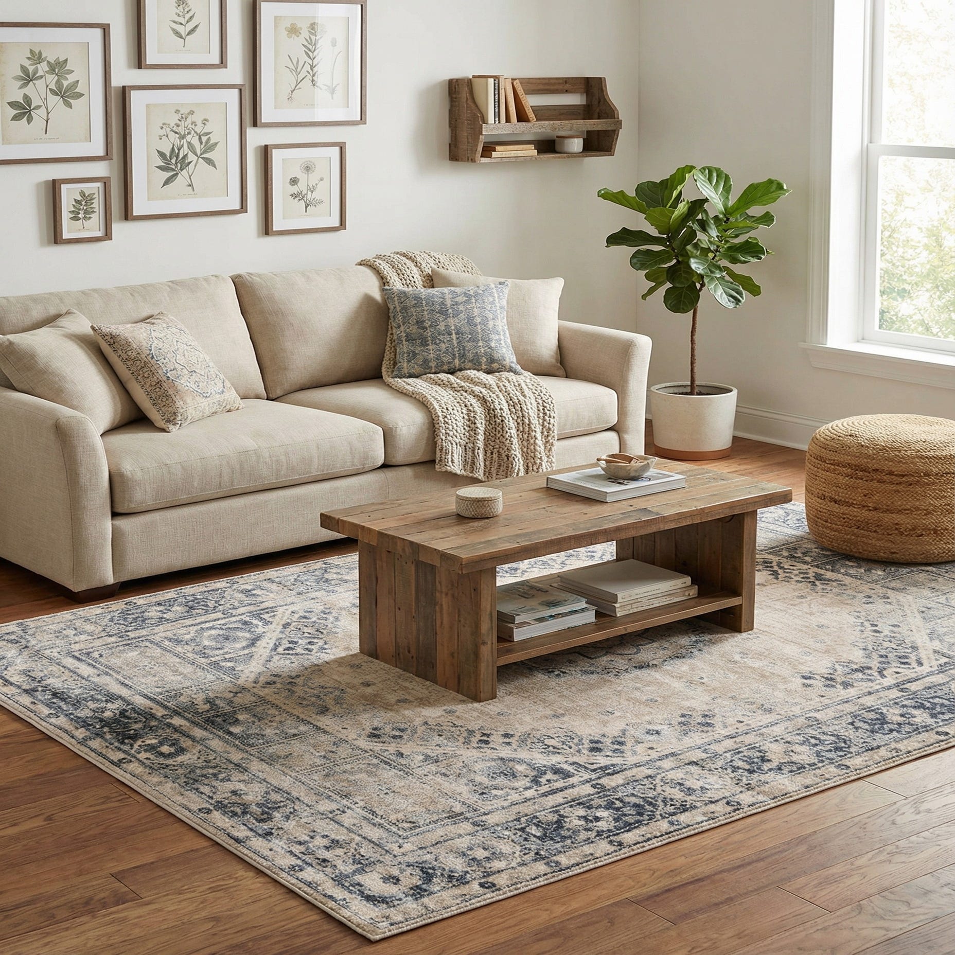 Primary color is Light Beige. Colors in this rug include: Light Beige, Ivory, Navy Blue, Gray.