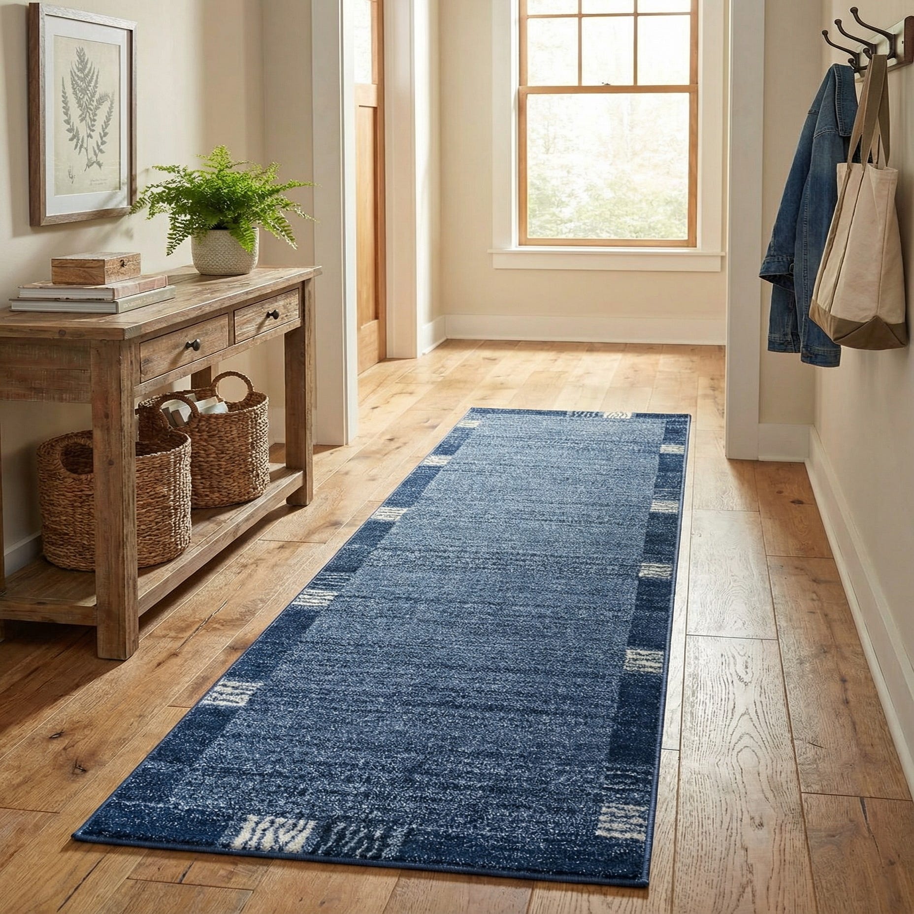 Primary color is Light Blue. Colors in this rug include: Light Blue, Blue, Navy Blue, Ivory.