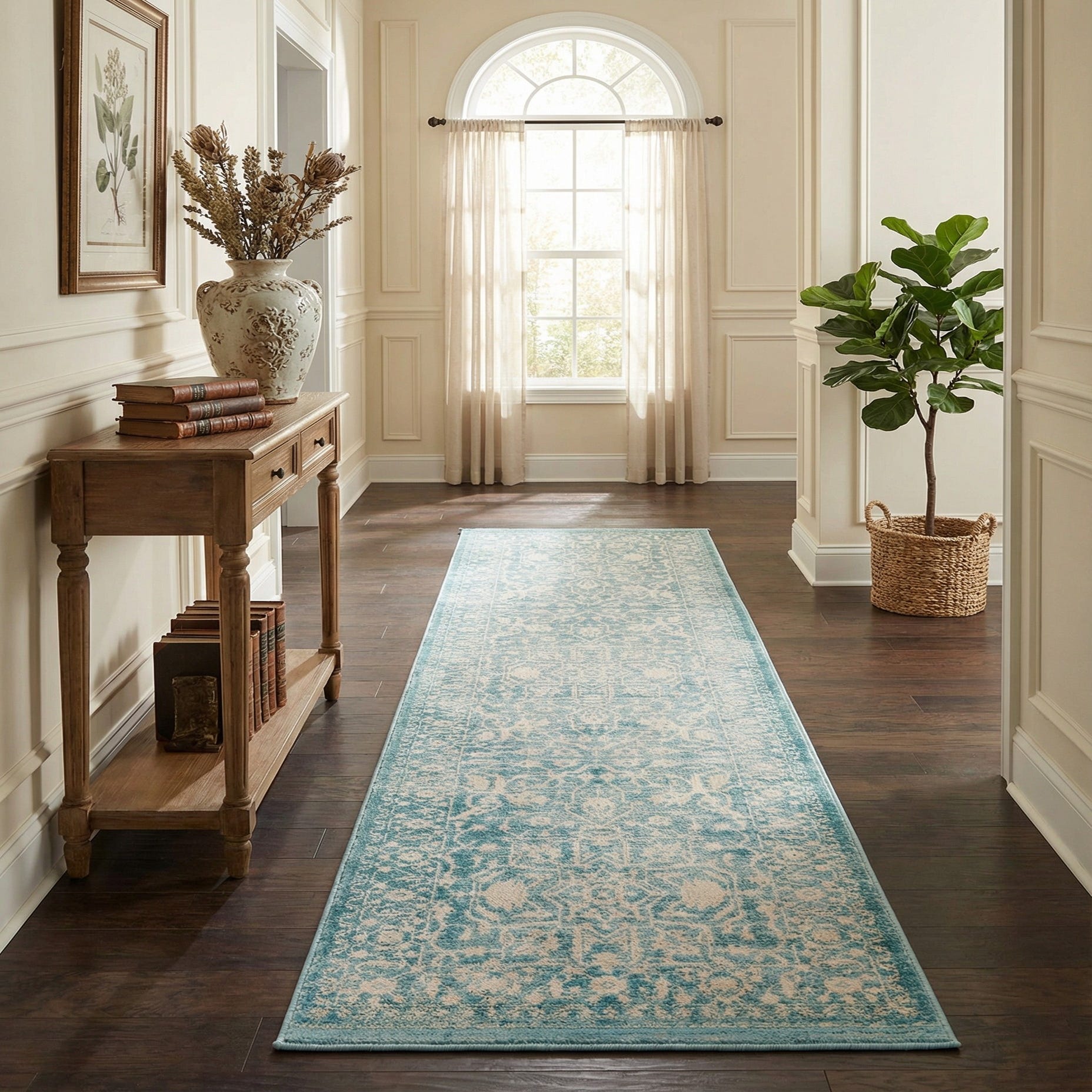 Primary color is Light Blue. Colors in this rug include: Light Blue, Ivory.