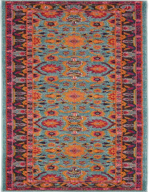 Primary color is Light Blue. Colors in this rug include: Light Blue, Orange, Red, Violet, Purple, Brown, Ivory, Gold.