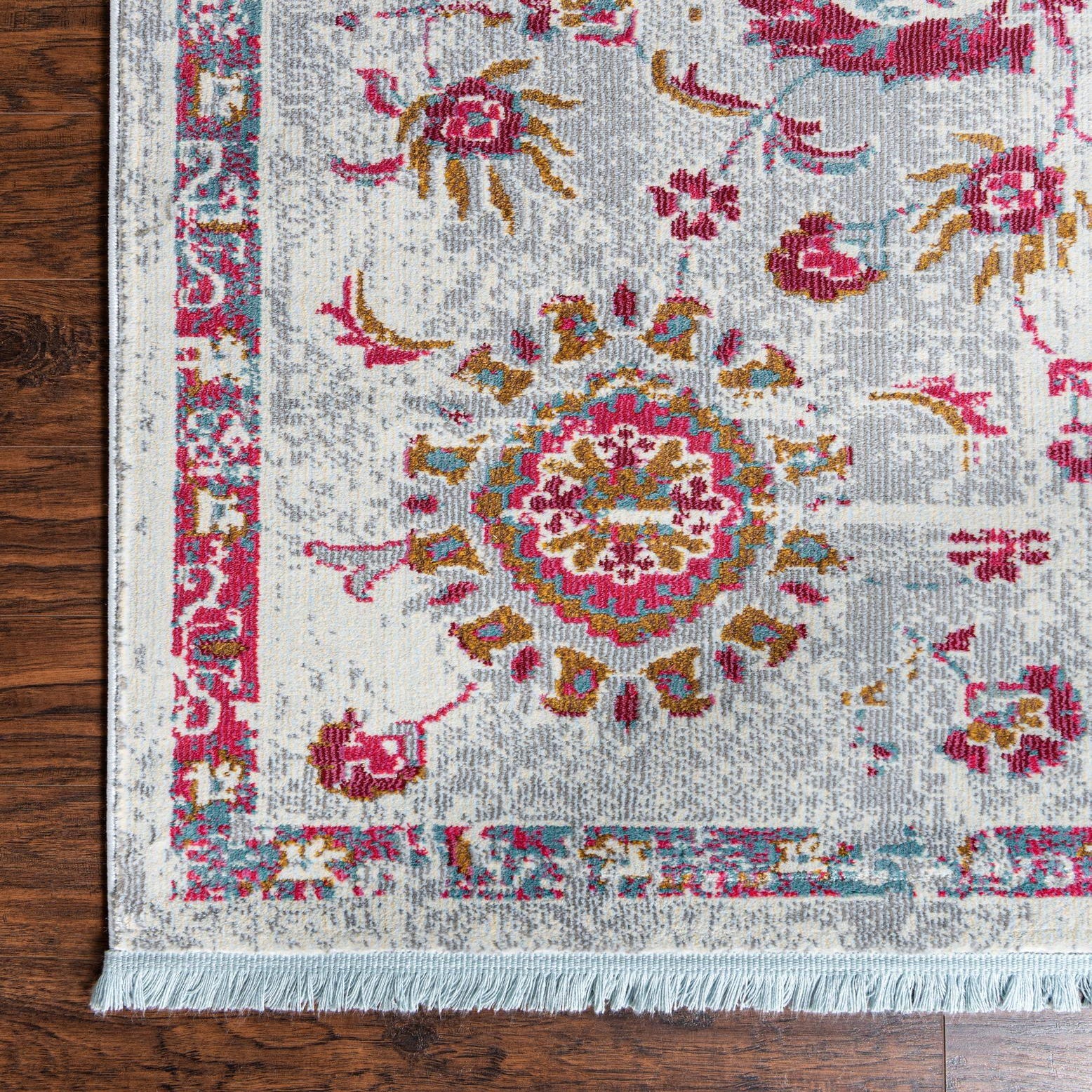 Primary color is Light Blue. Colors in this rug include: Light Blue, Gold, Gray, Ivory, Olive, Pink, Blue, Red.