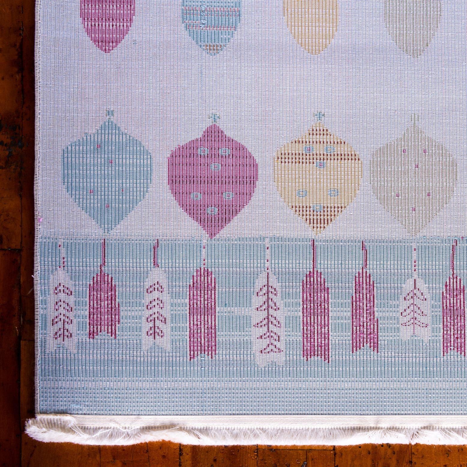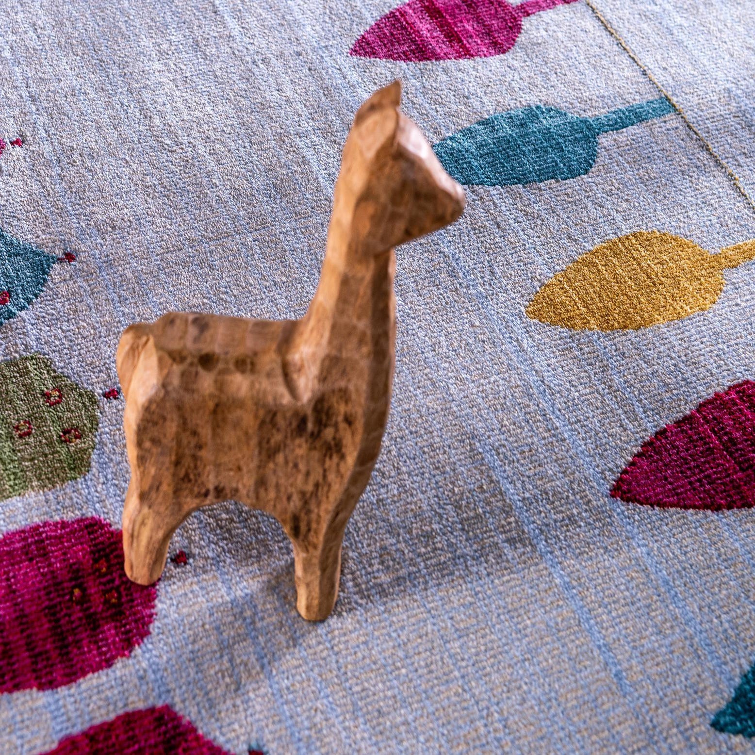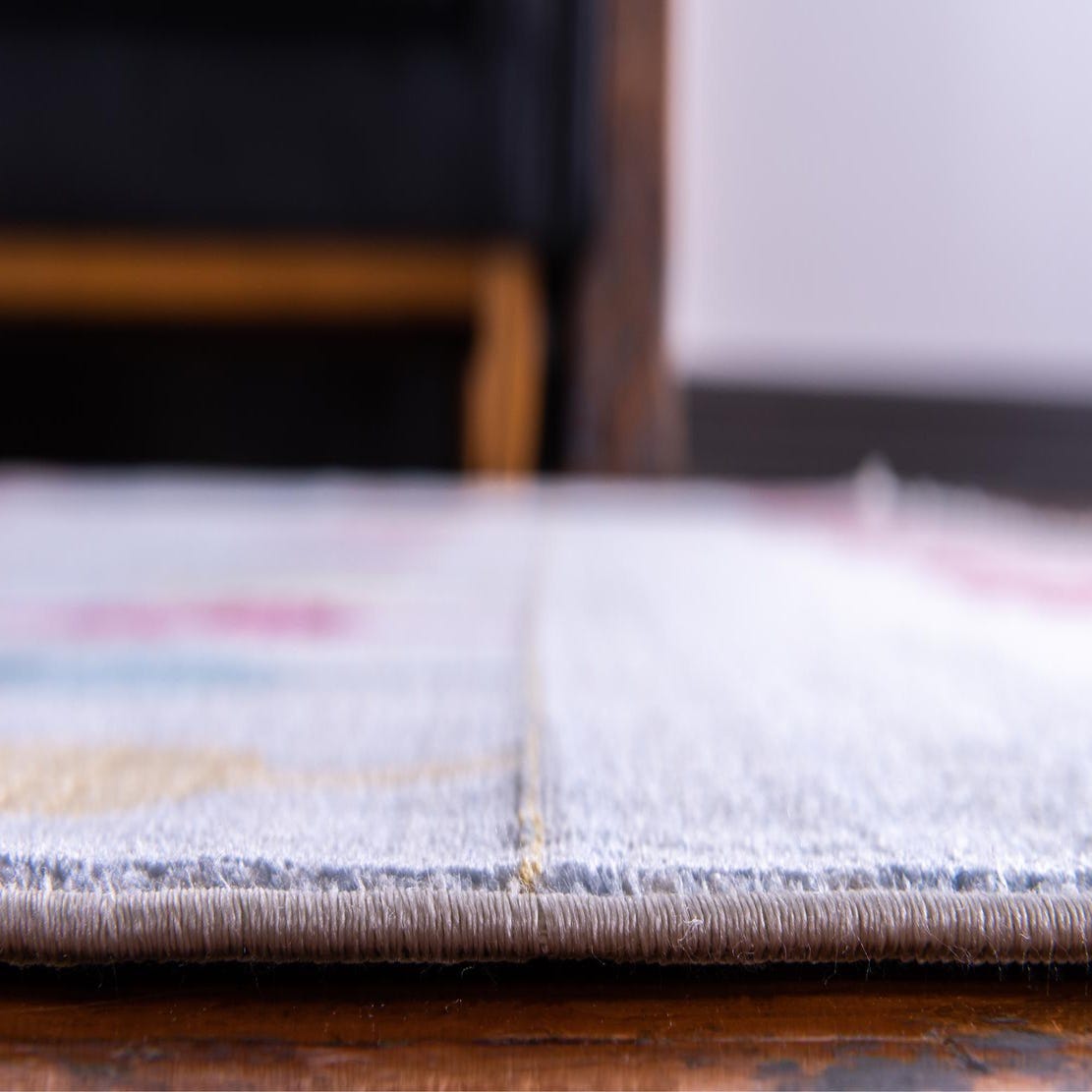Primary color is Light Blue. Colors in this rug include: Light Blue, Blue, Green, Red, Teal, Pink, Yellow.