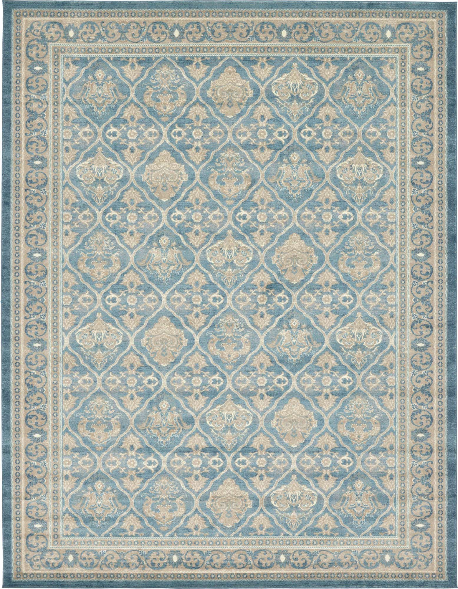 Primary color is Light Blue. Colors in this rug include: Light Blue, Gray, Ivory.