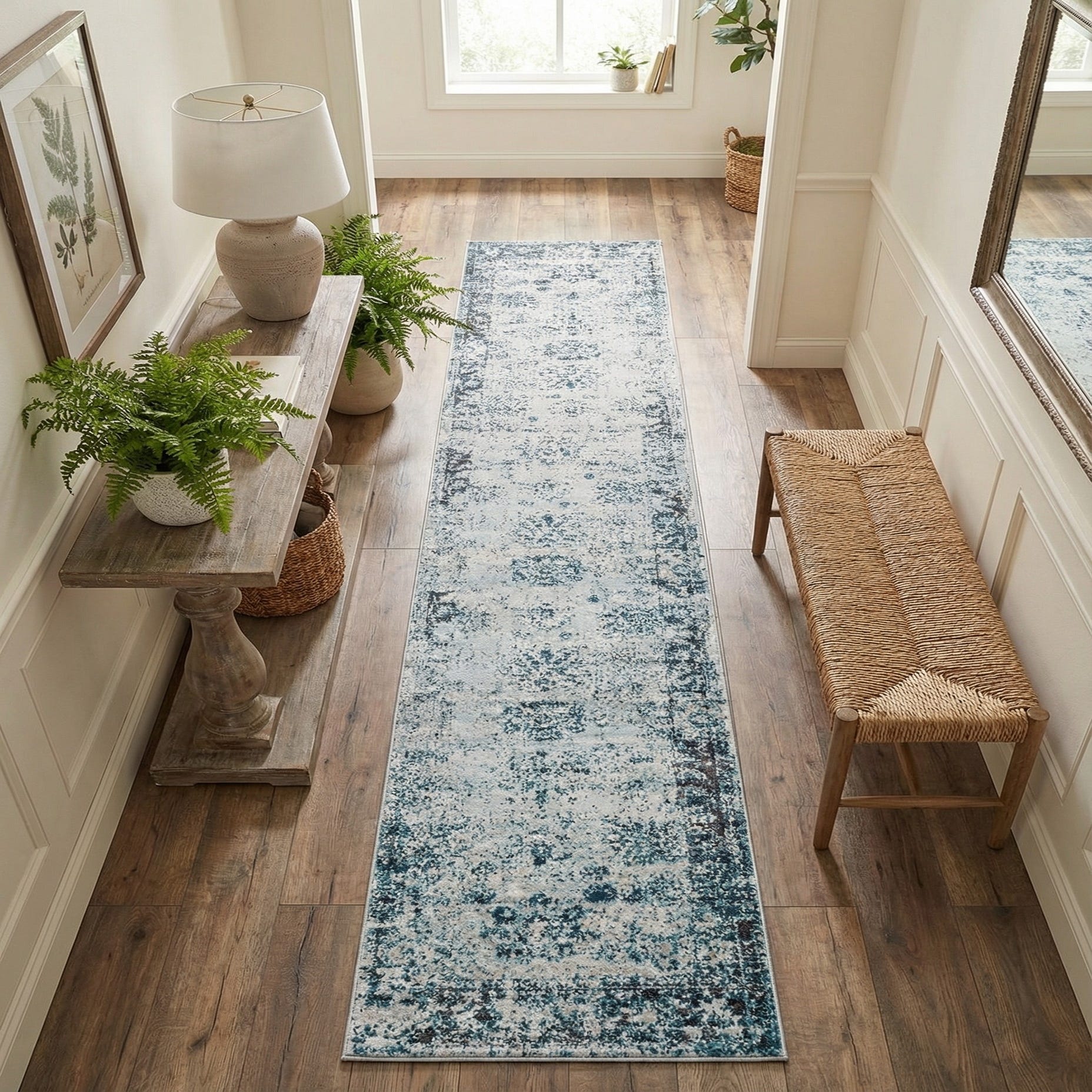 Primary color is Light Blue. Colors in this rug include: Light Blue, Gray, Ivory, Blue.
