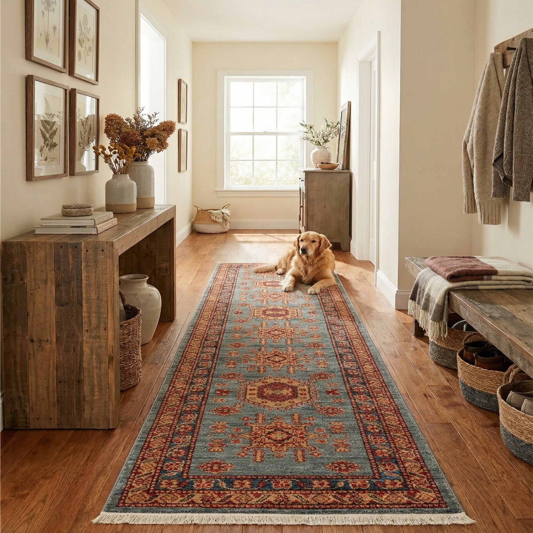 Primary color is Light Blue. Colors in this rug include: Light Blue, Light Brown, Light Green, Red, Blue.