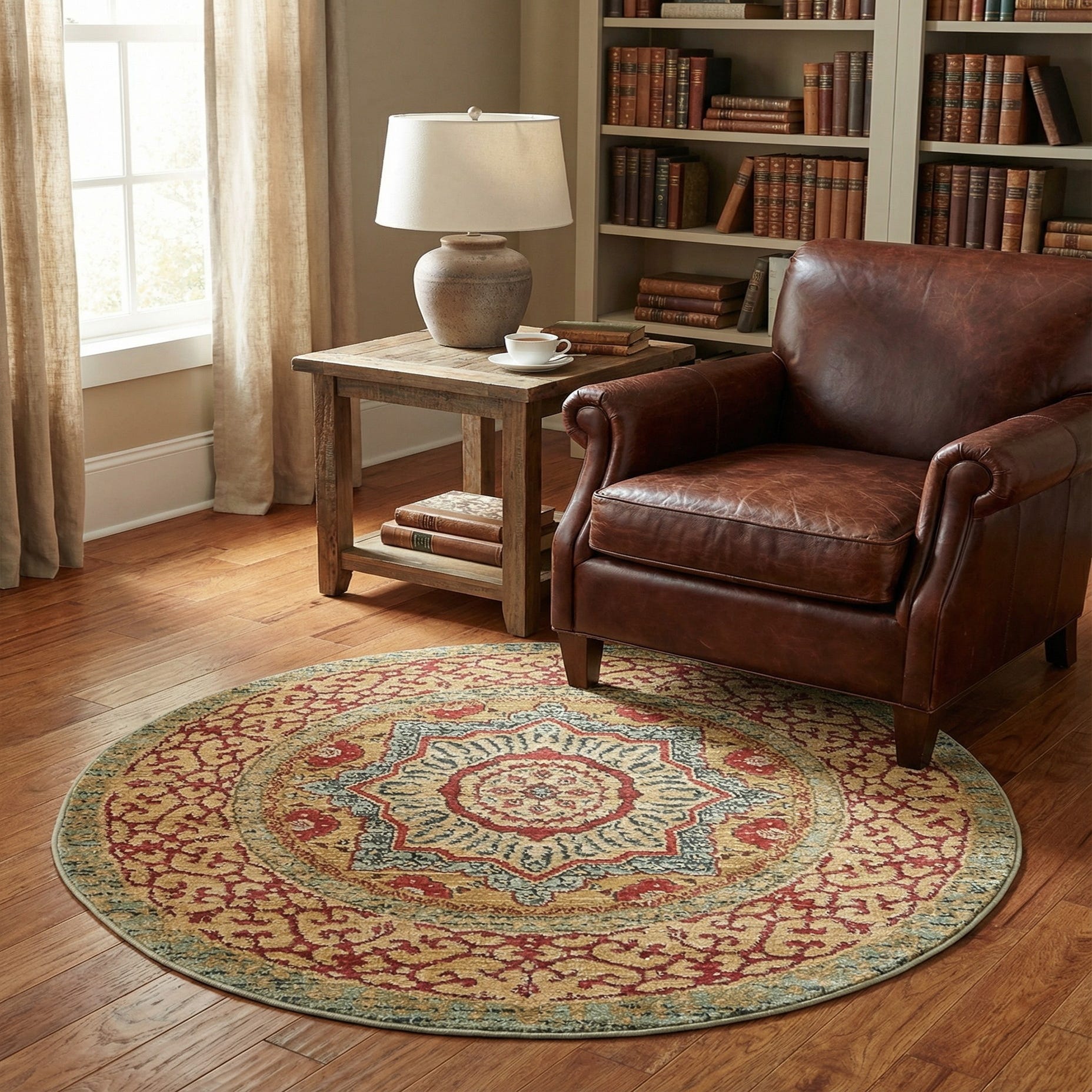 Primary color is Light Blue. Colors in this rug include: Light Blue, Light Brown, Light Green, Red, Navy Blue.
