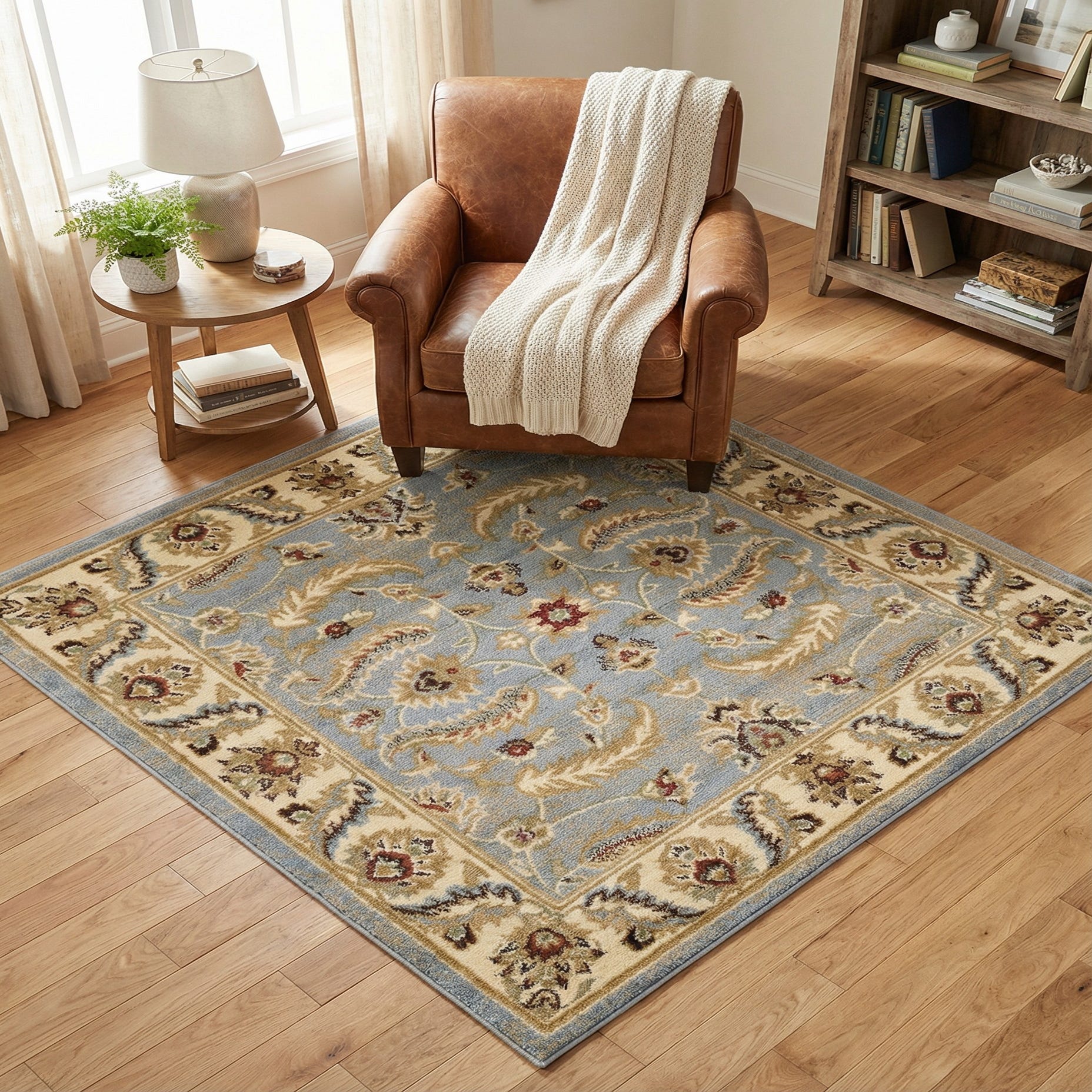 Primary color is Light Blue. Colors in this rug include: Light Blue, Brown, Cream, Green, Red, Rust Red, Tan.