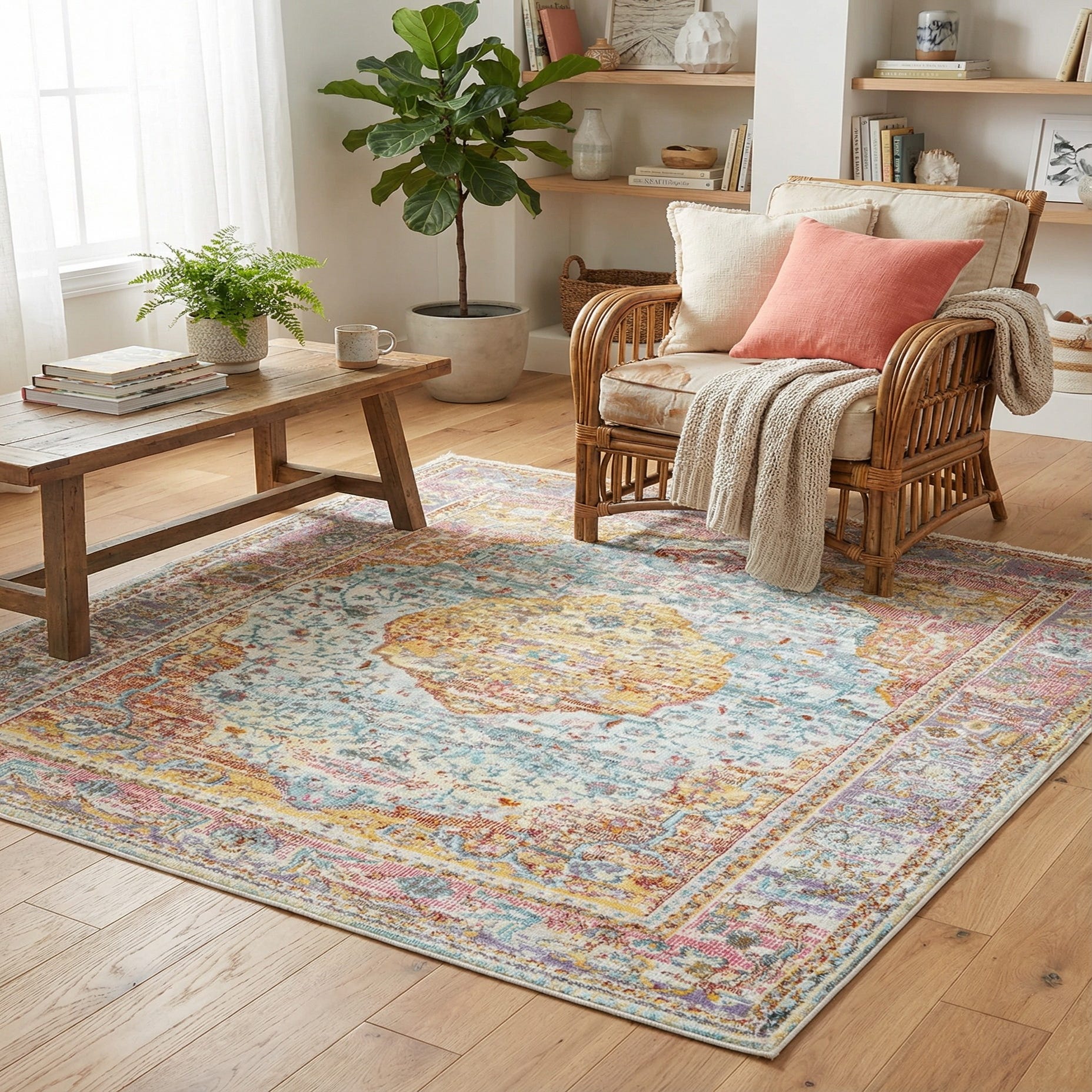 Primary color is Light Blue. Colors in this rug include: Light Blue, Blue, Gold, Purple, Red, Olive, Yellow.