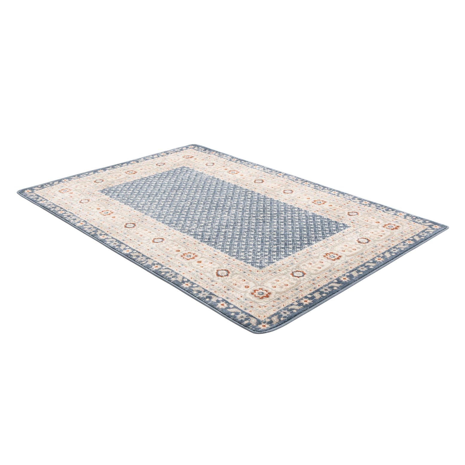 Primary color is Light Blue. Colors in this rug include: Light Blue, Gray, Ivory, Rust Red, Pink.