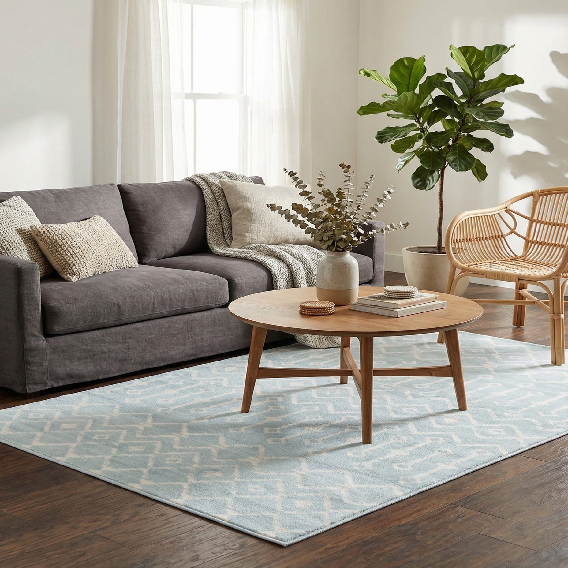 Primary color is Light Blue. Colors in this rug include: Light Blue, Ivory.