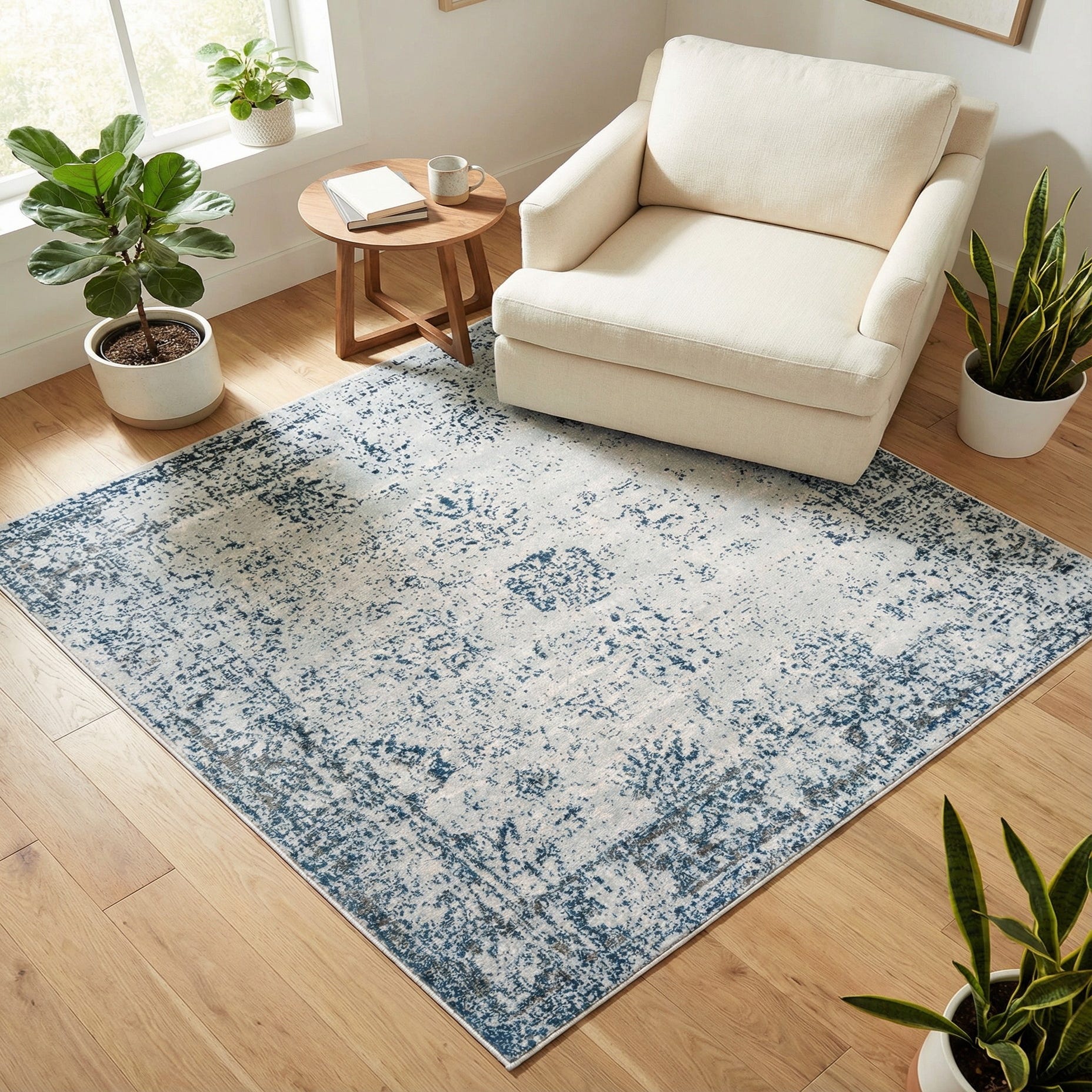 Primary color is Light Blue. Colors in this rug include: Light Blue, Blue, Ivory, Gray.