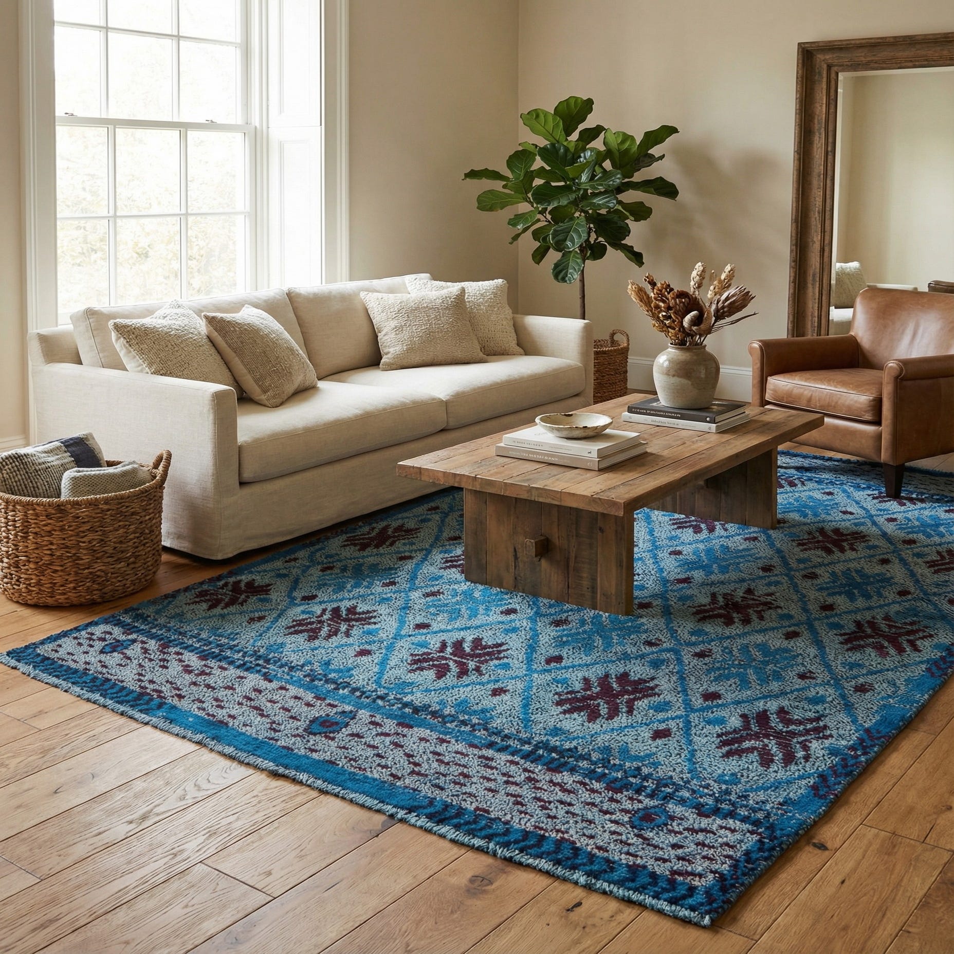 Primary color is Light Blue. Colors in this rug include: Light Blue, Burgundy, Blue.