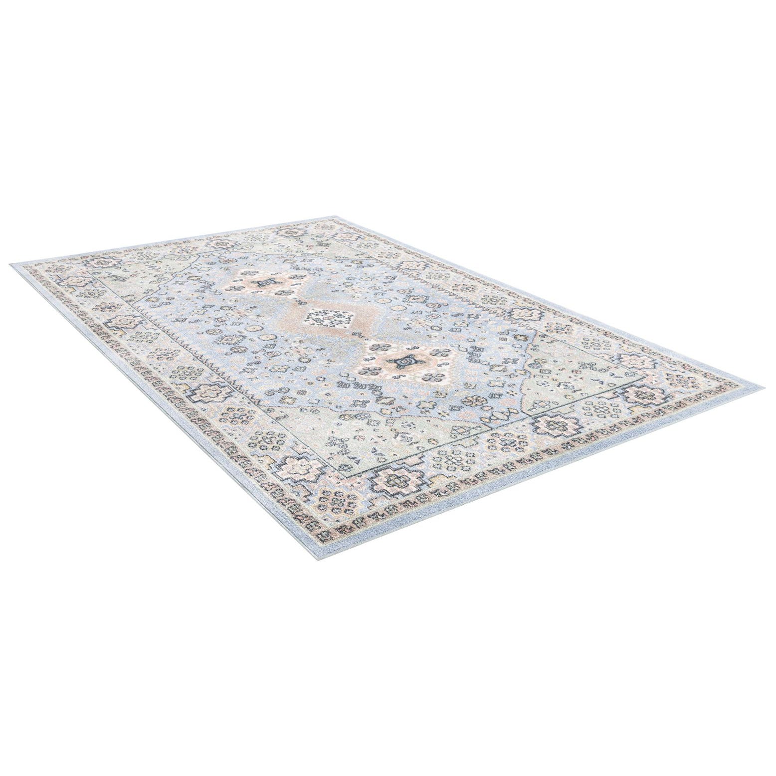 Primary color is Light Blue. Colors in this rug include: Light Blue, Ivory, Light Green, Pink, Beige, Yellow.