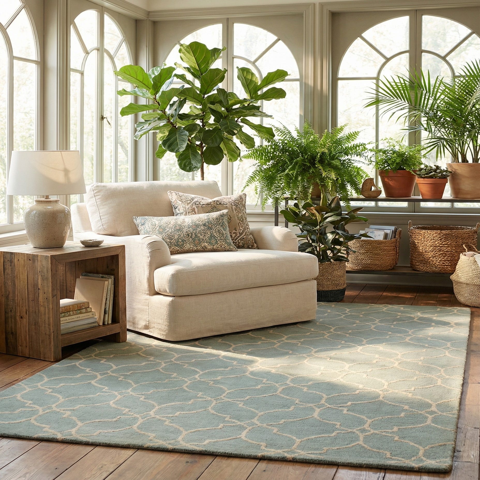 Primary color is Light Blue. Colors in this rug include: Light Blue, Ivory.
