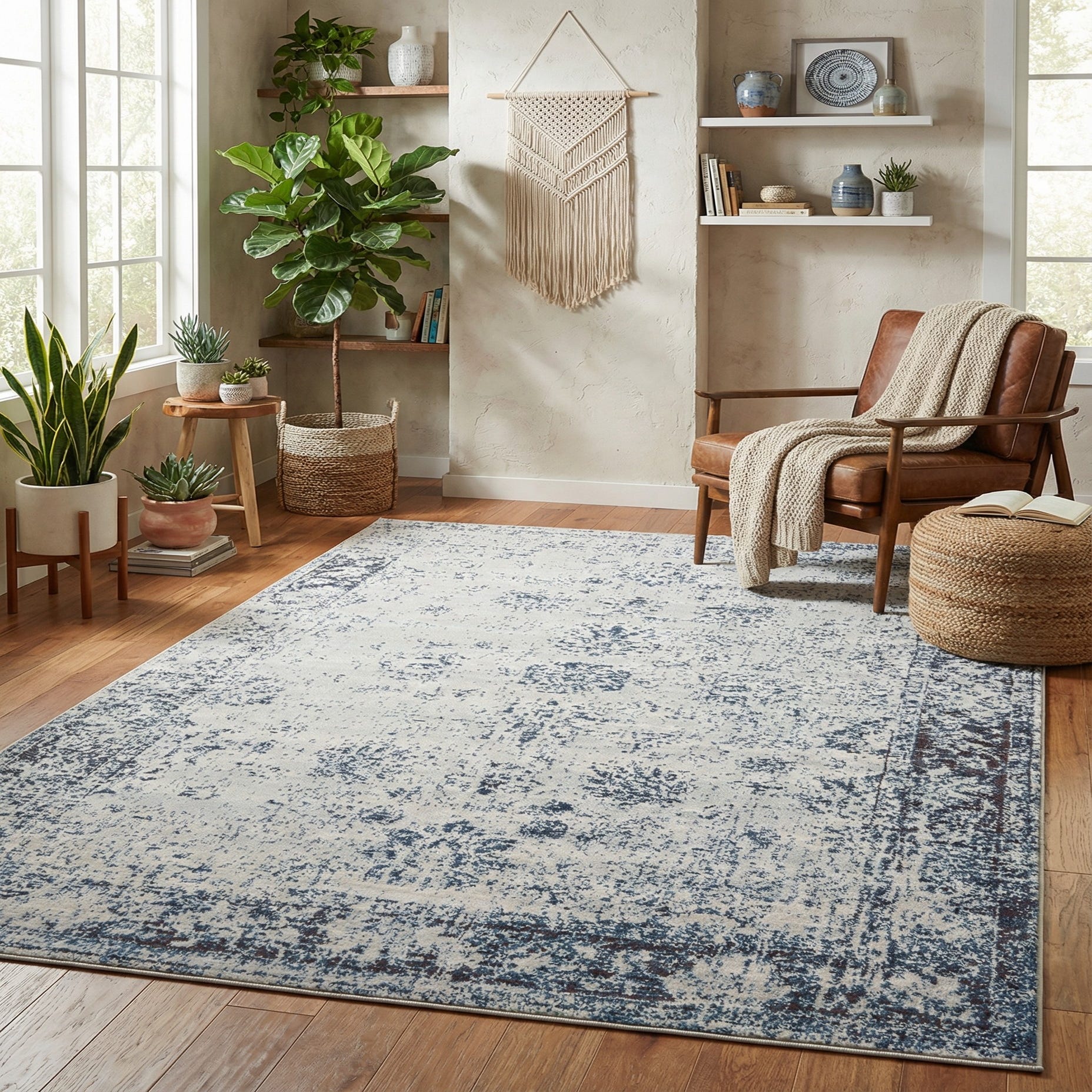 Primary color is Light Blue. Colors in this rug include: Light Blue, Gray, Ivory, Blue.