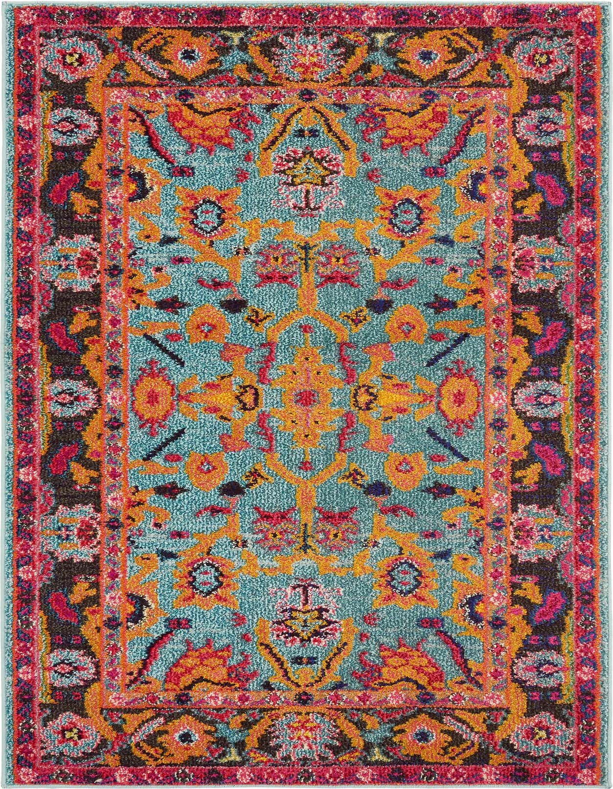 Primary color is Light Blue. Colors in this rug include: Light Blue, Orange, Red, Violet, Purple, Brown, Ivory, Gold.