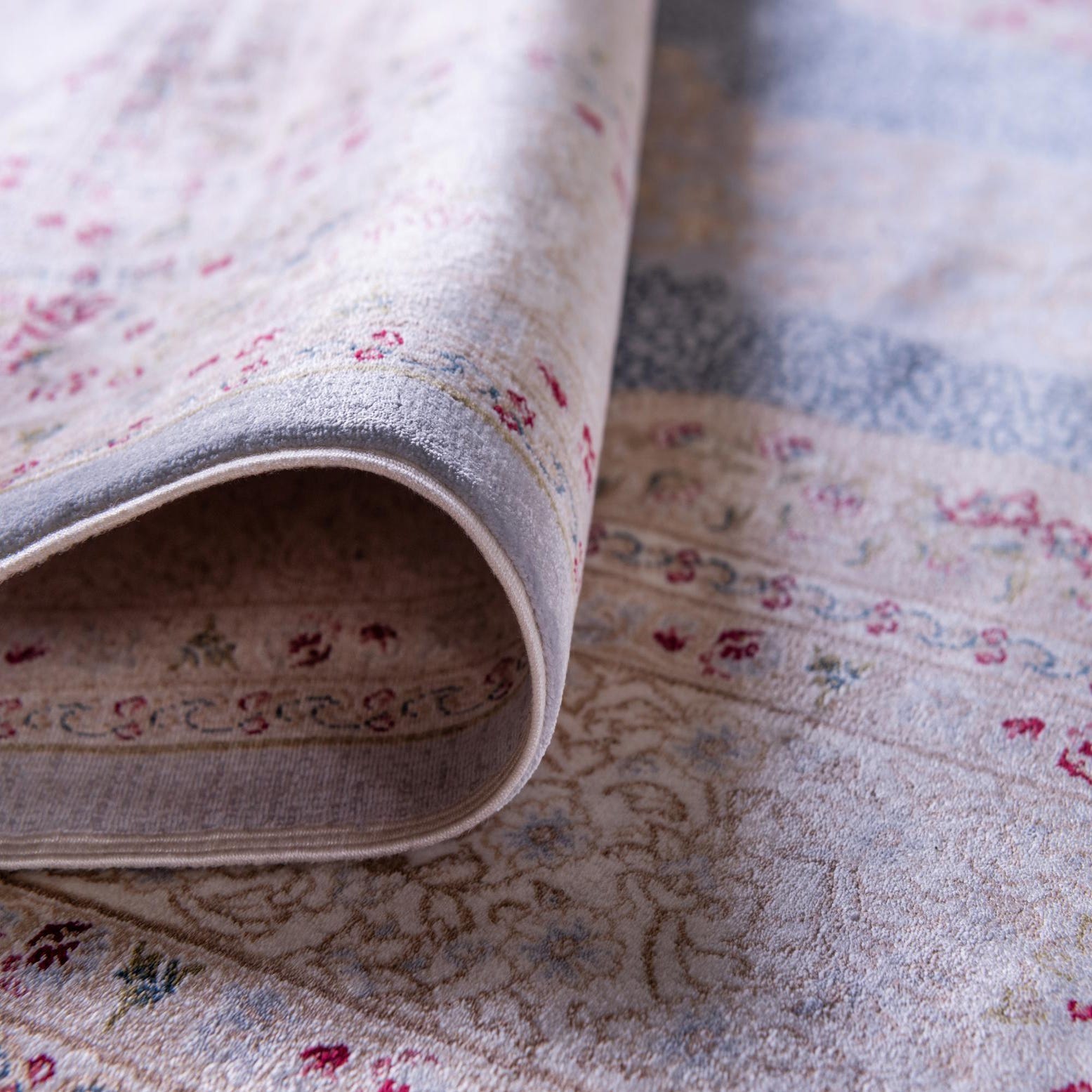 Primary color is Light Blue. Colors in this rug include: Light Blue, Beige, Green, Ivory, Light Green, Red, Pink.