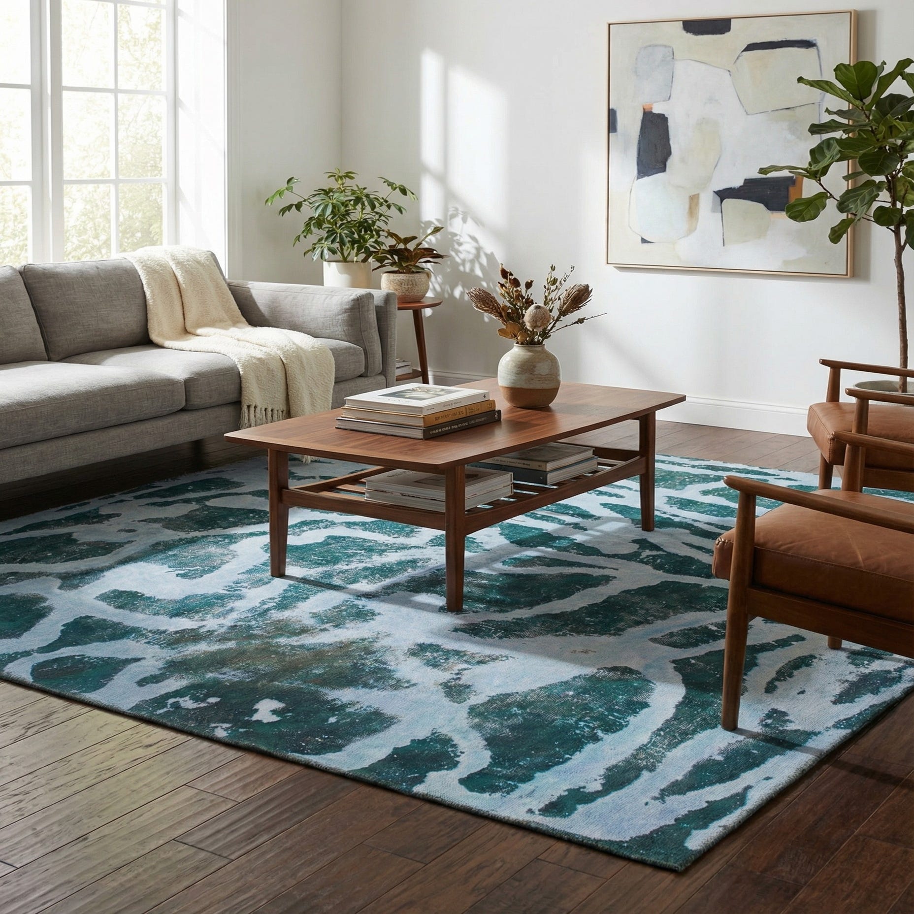 Primary color is Light Blue. Colors in this rug include: Light Blue, Hunter Green, Black.