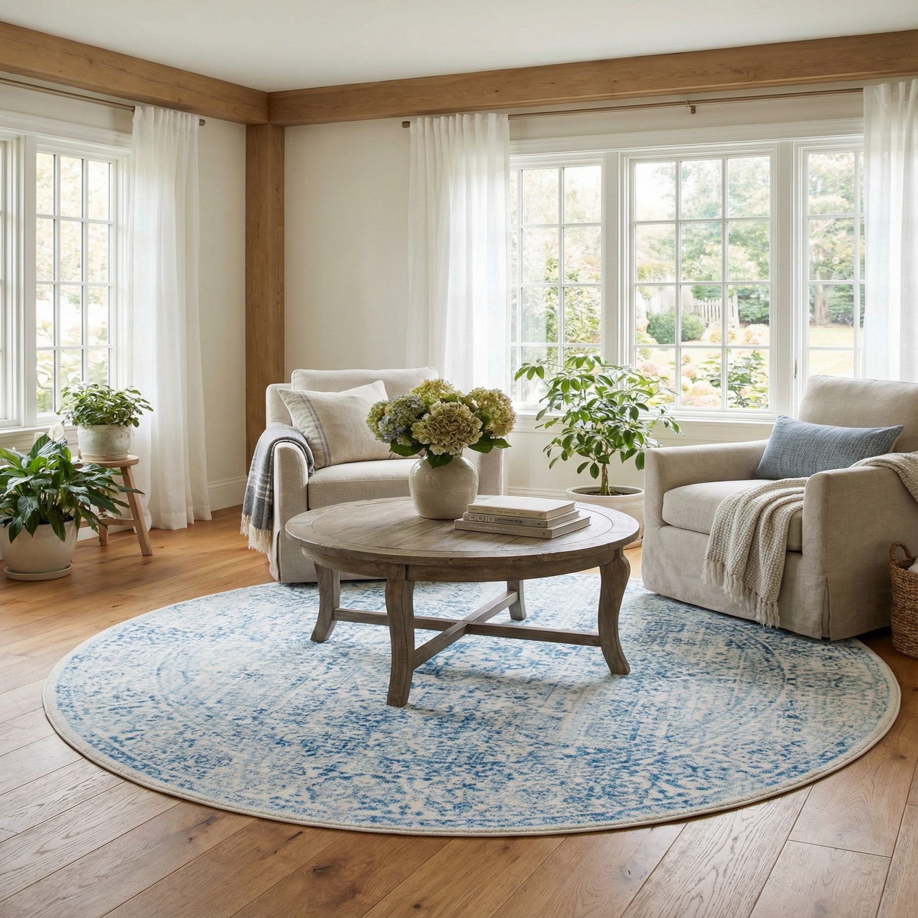 Primary color is Light Blue. Colors in this rug include: Light Blue, Ivory, Navy Blue.