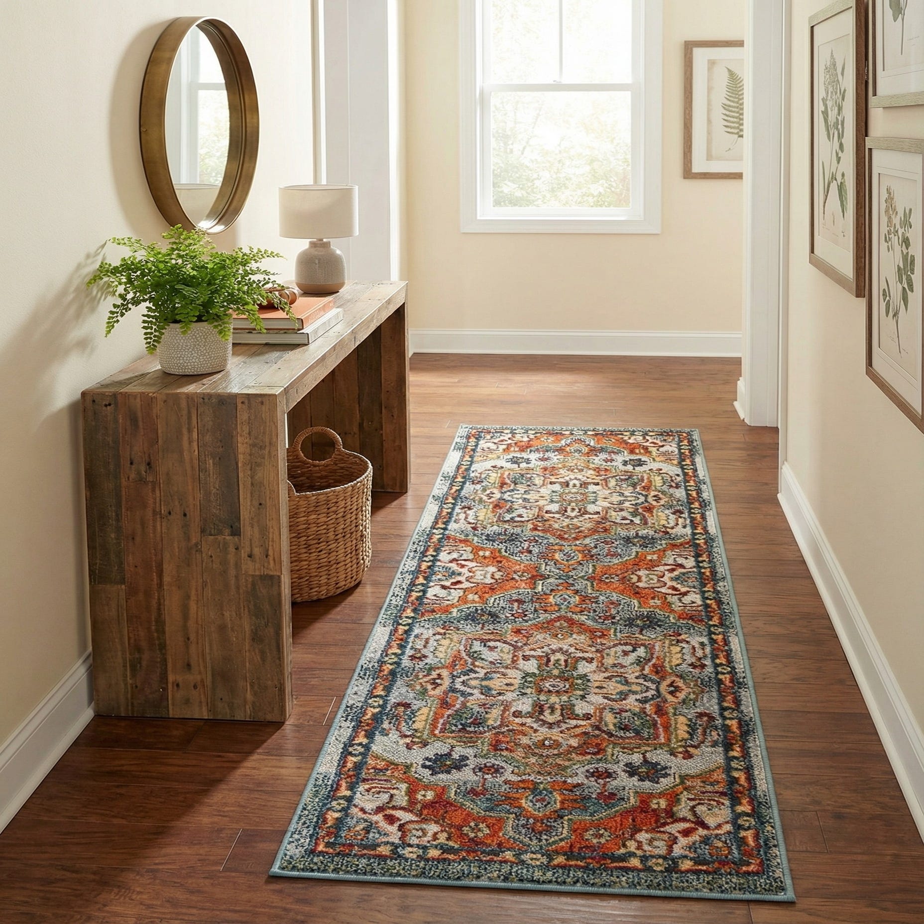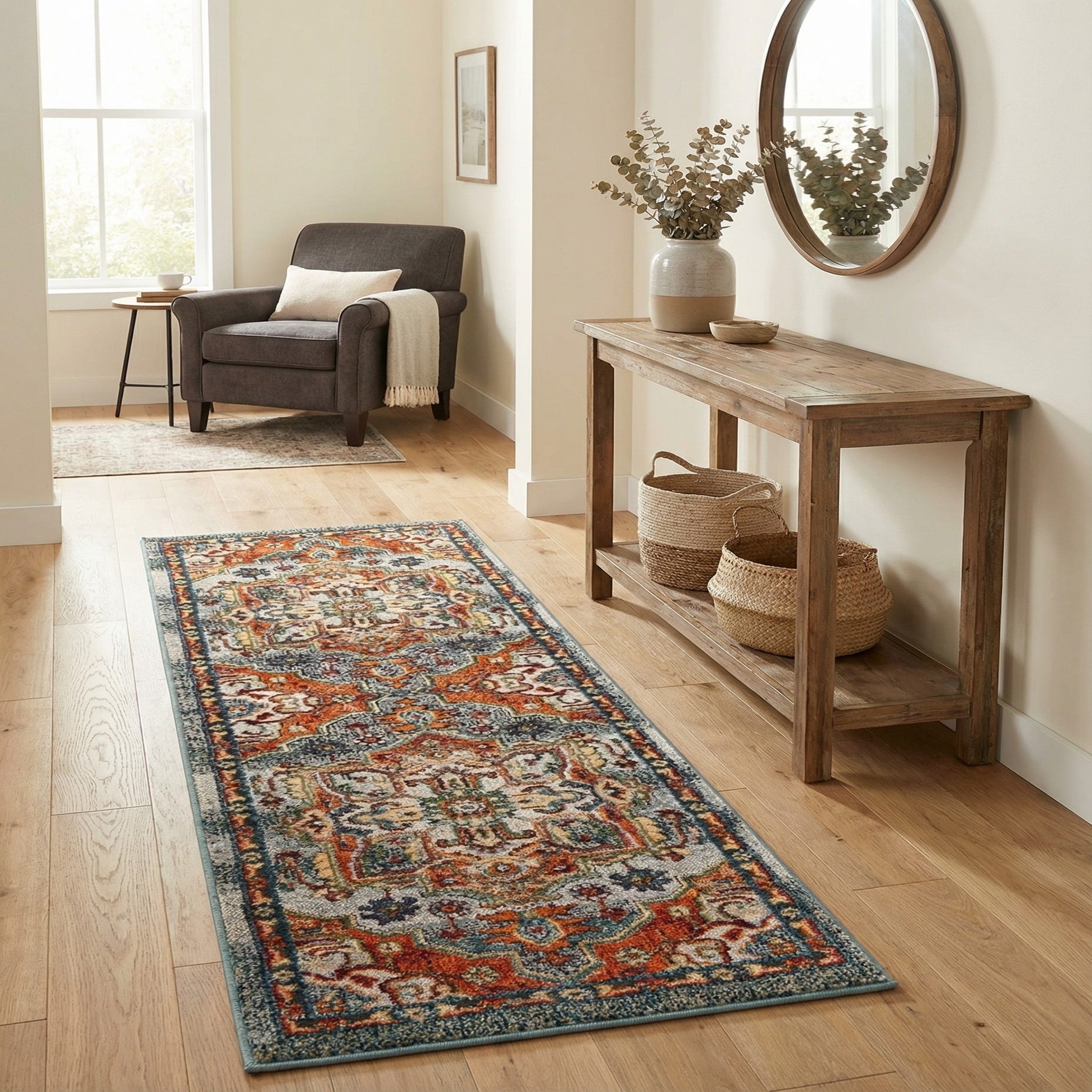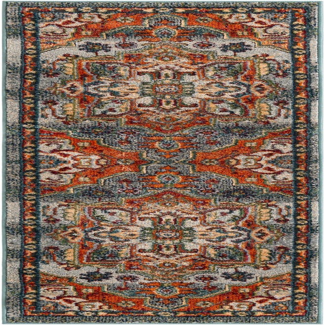 Primary color is Light Blue. Colors in this rug include: Light Blue, Beige, Blue, Green, Ivory, Navy Blue, Peach, Orange, Plum Red, Purple, Red.