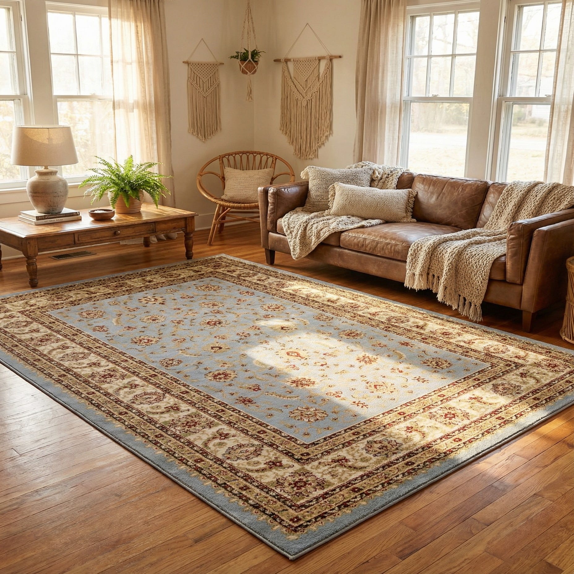 Primary color is Light Blue. Colors in this rug include: Light Blue, Brown, Cream, Green, Tan.