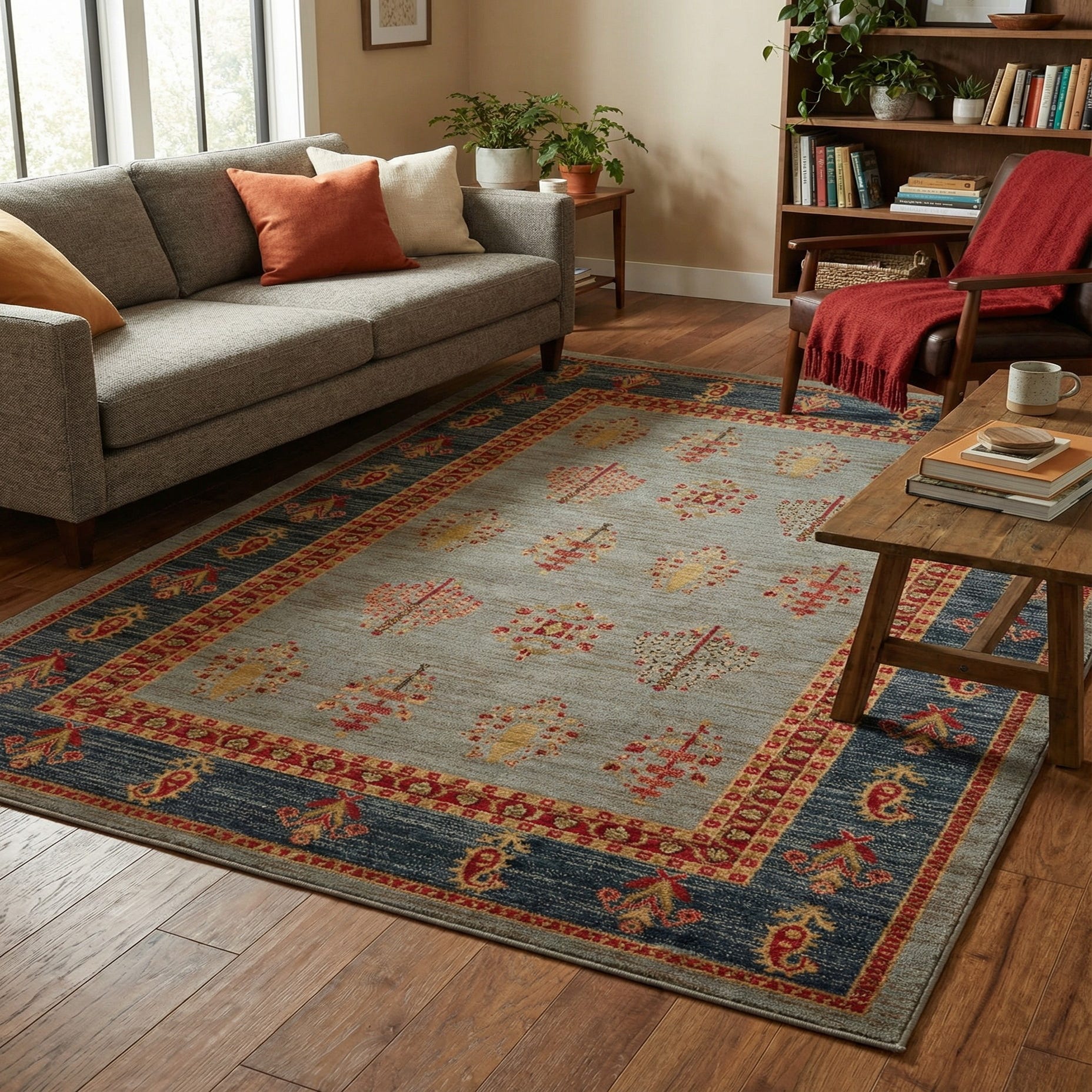 Primary color is Light Blue. Colors in this rug include: Light Blue, Blue, Gray, Light Brown, Red, Tan.