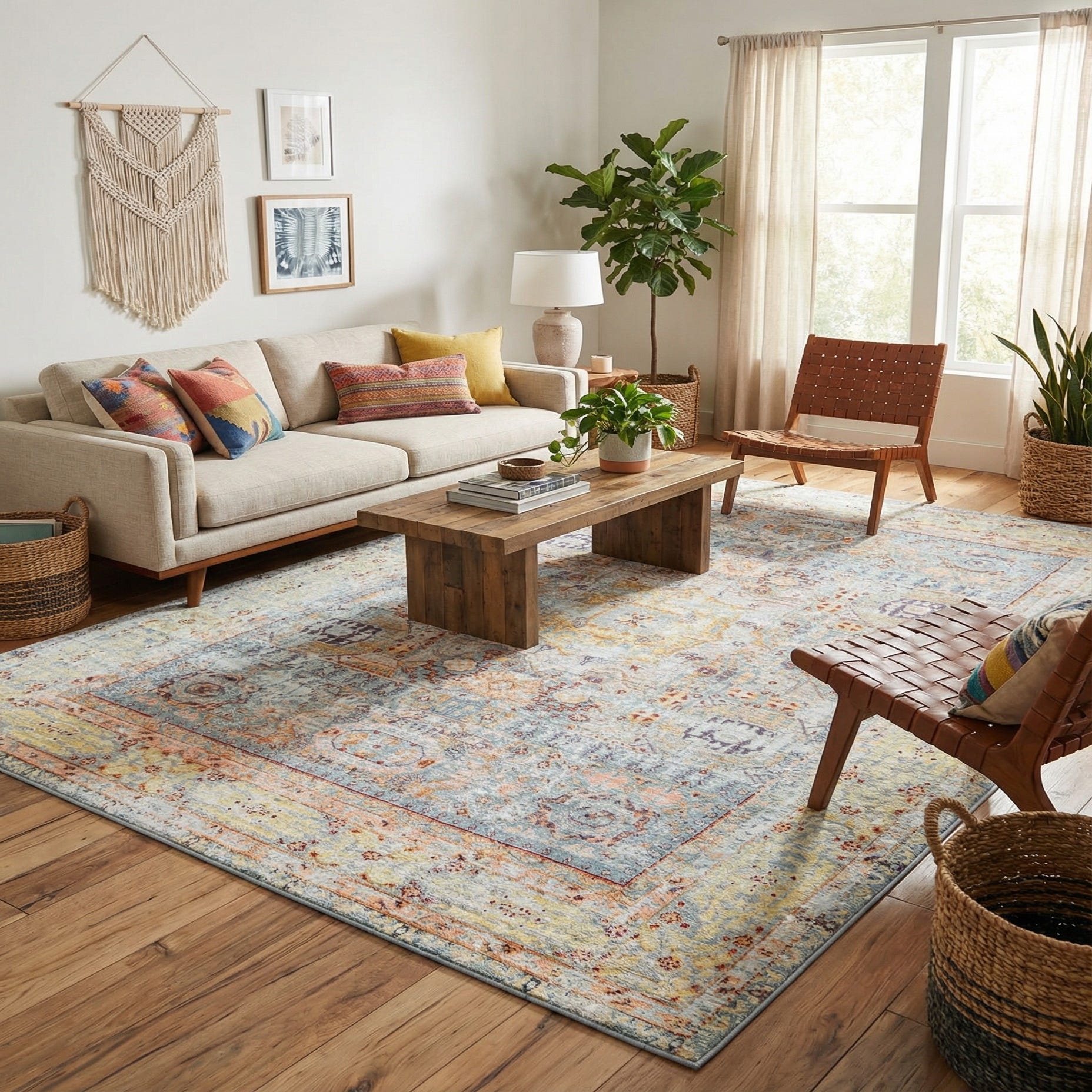 Primary color is Light Blue. Colors in this rug include: Light Blue, Cream, Gold, Ivory, Peach, Red, Gray, Yellow.