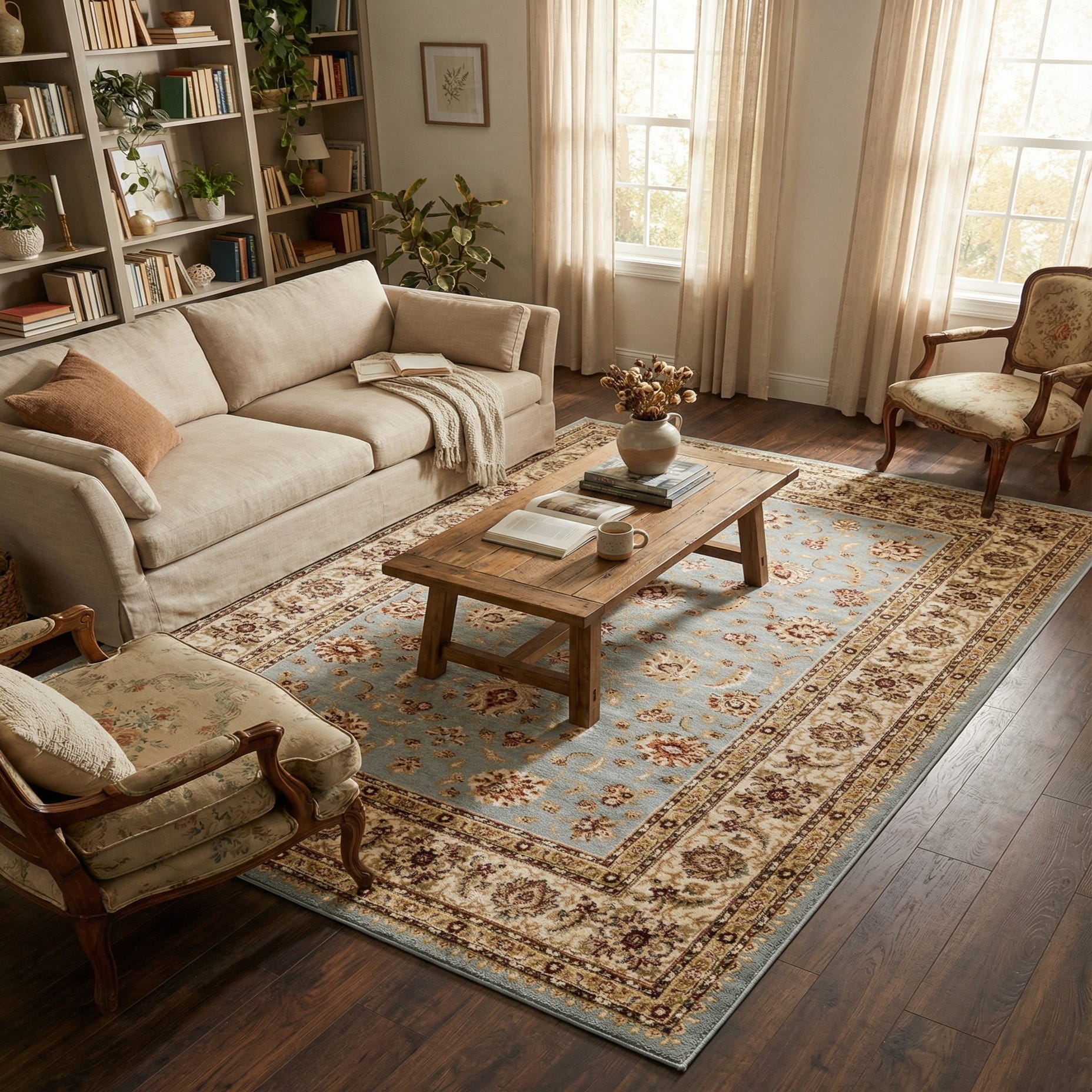 Primary color is Light Blue. Colors in this rug include: Light Blue, Cream, Green, Red, Tan, Brown.