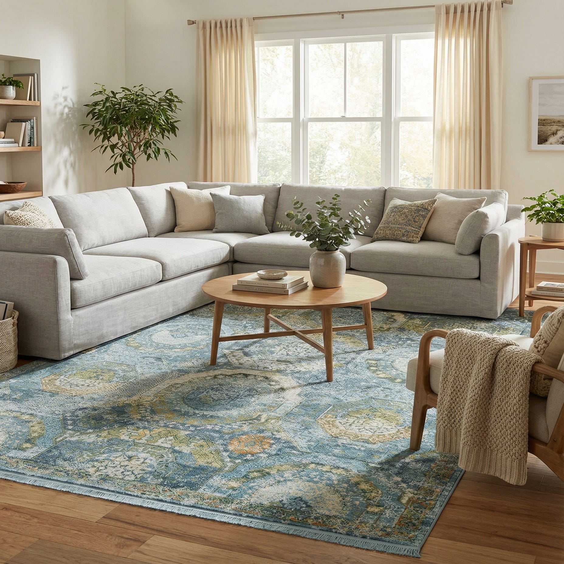 Primary color is Light Blue. Colors in this rug include: Light Blue, Blue, Cream, Green, Ivory, Tan.