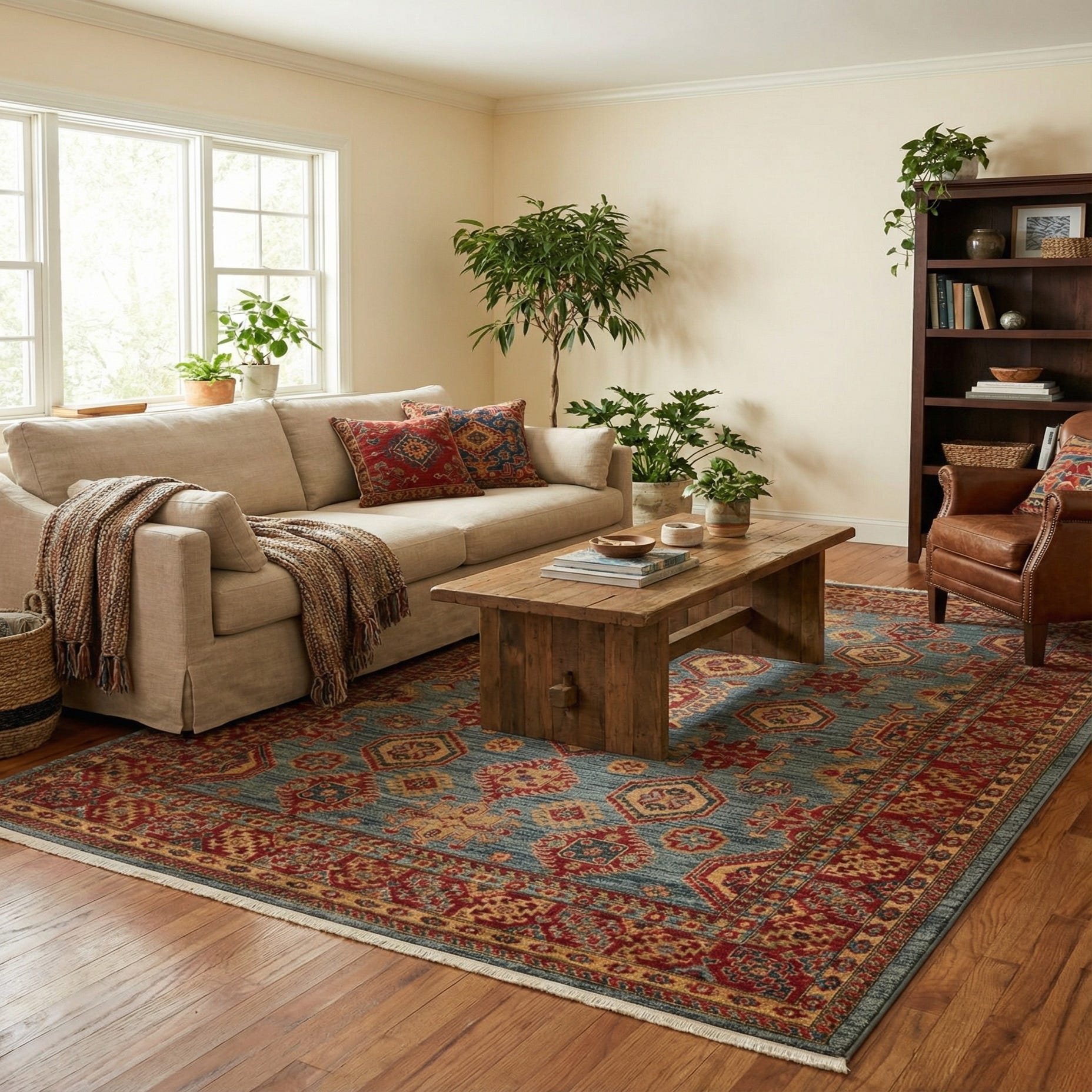 Primary color is Light Blue. Colors in this rug include: Light Blue, Blue, Light Green, Red, Tan.