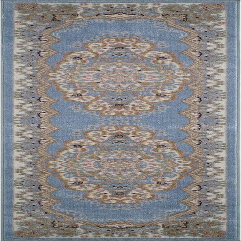 Primary color is Light Blue. Colors in this rug include: Light Blue, Beige, Ivory, Light Green, Pink.