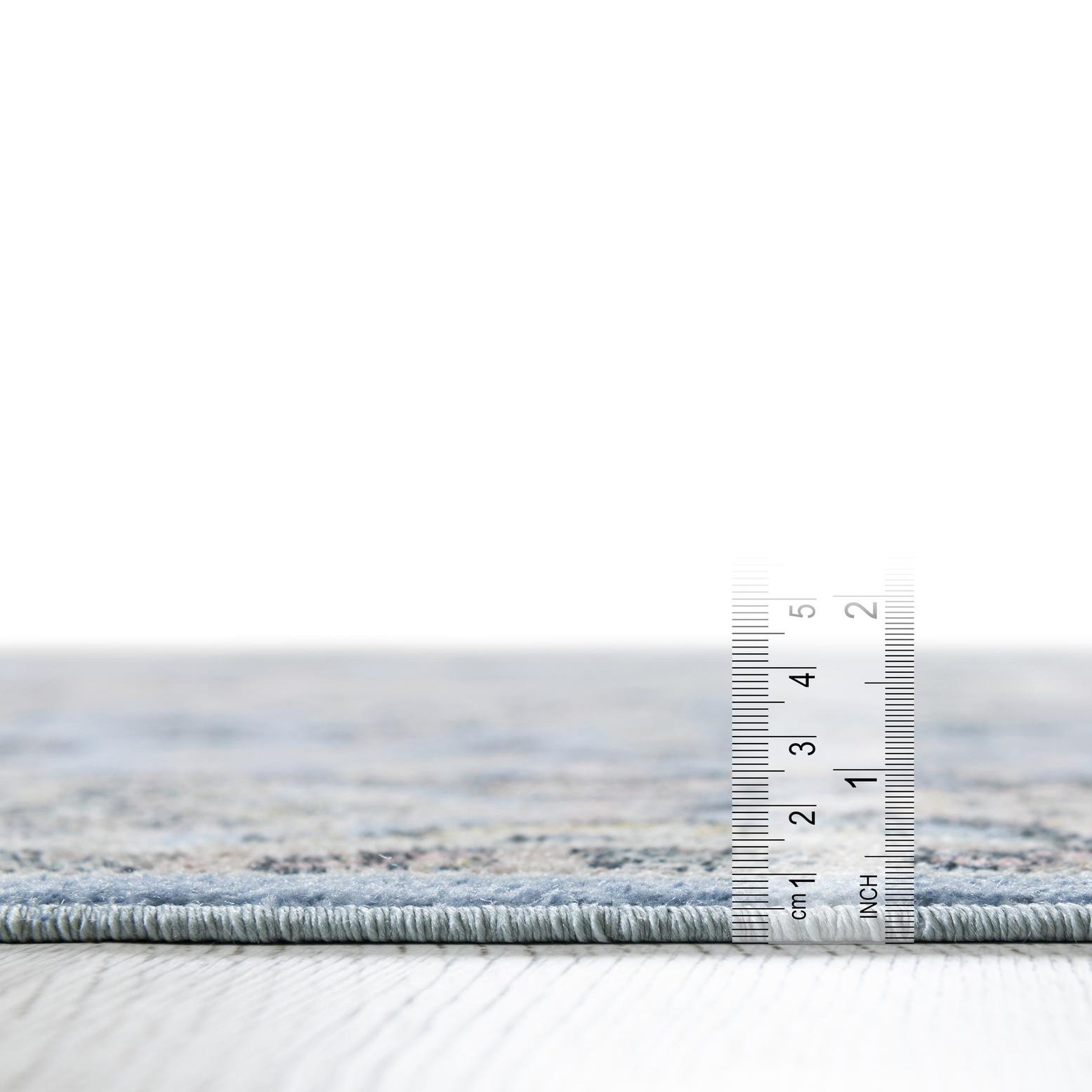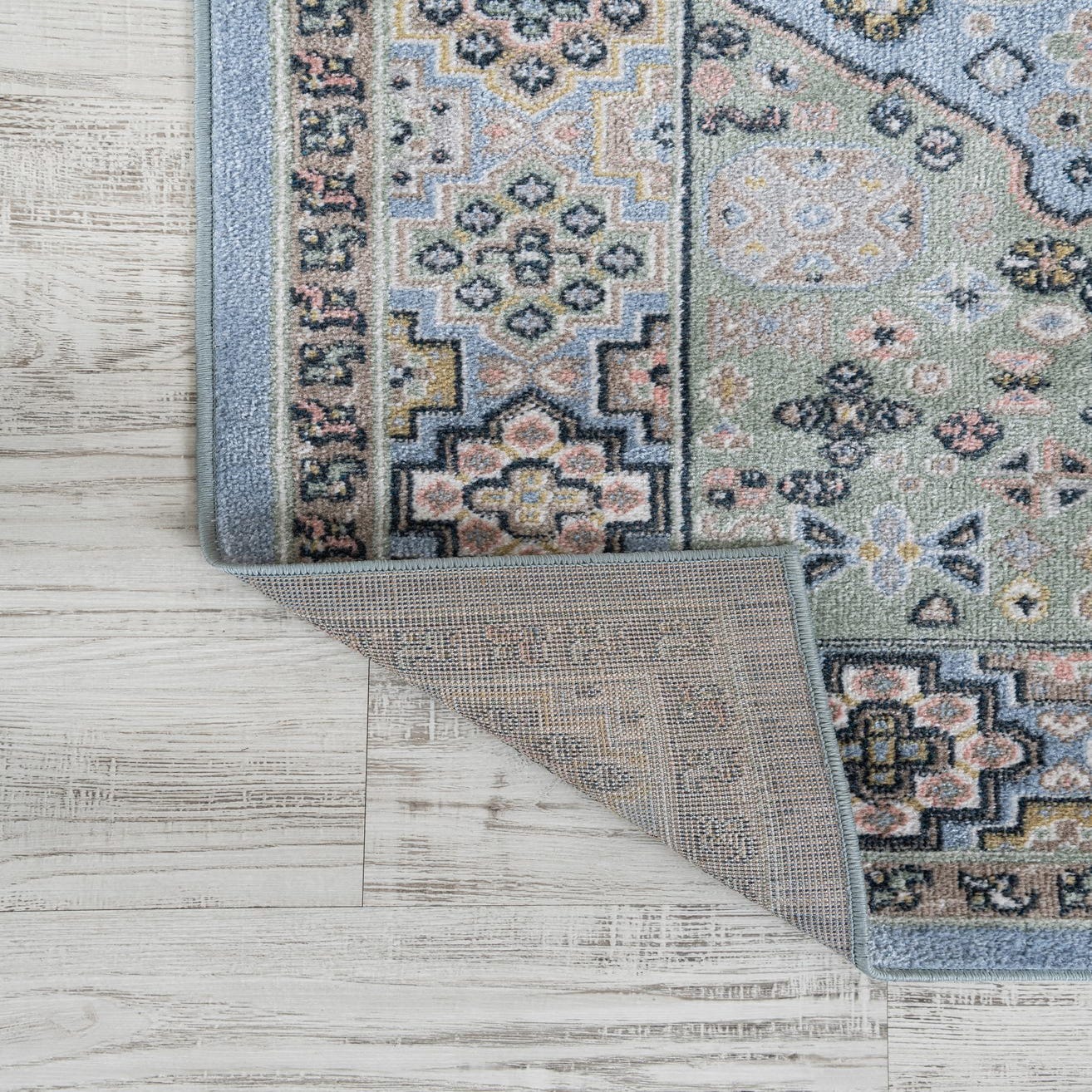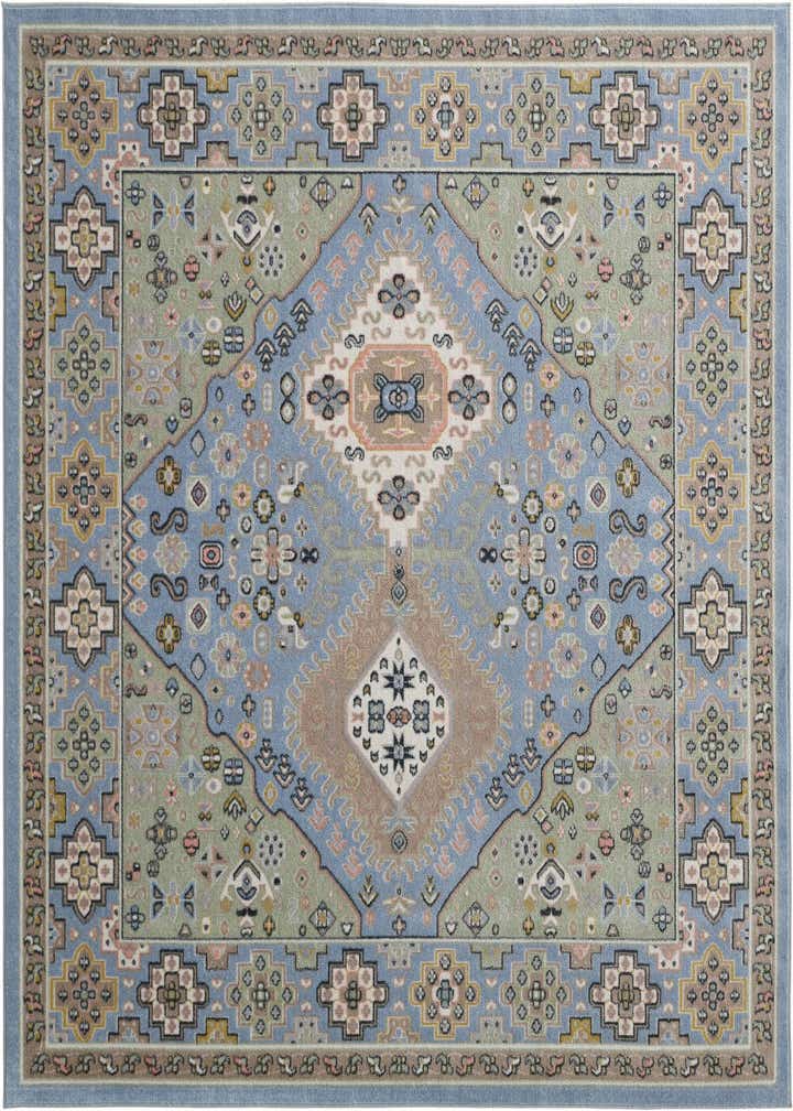 Primary color is Light Blue. Colors in this rug include: Light Blue, Beige, Black, Gray, Ivory, Pink.