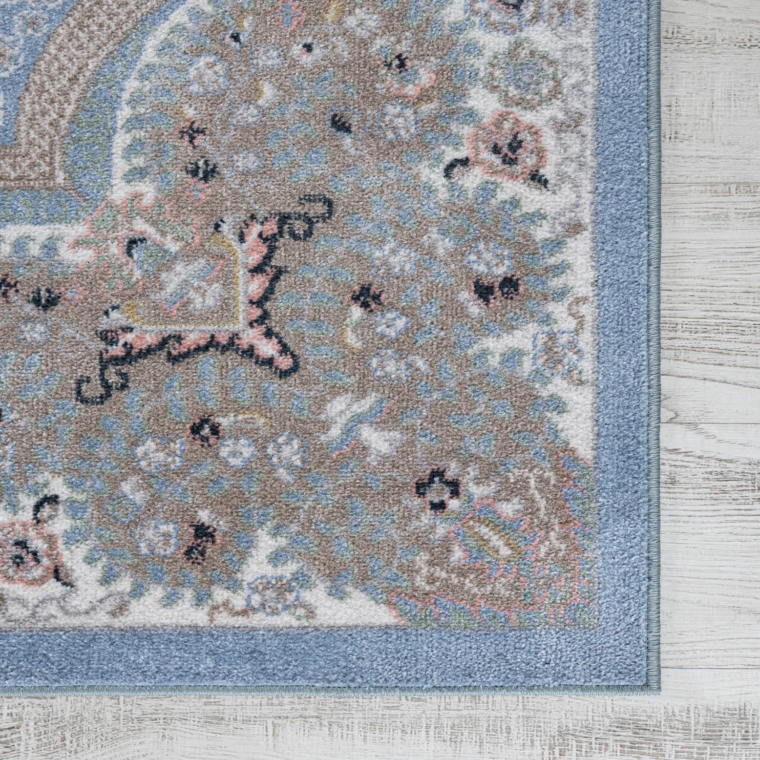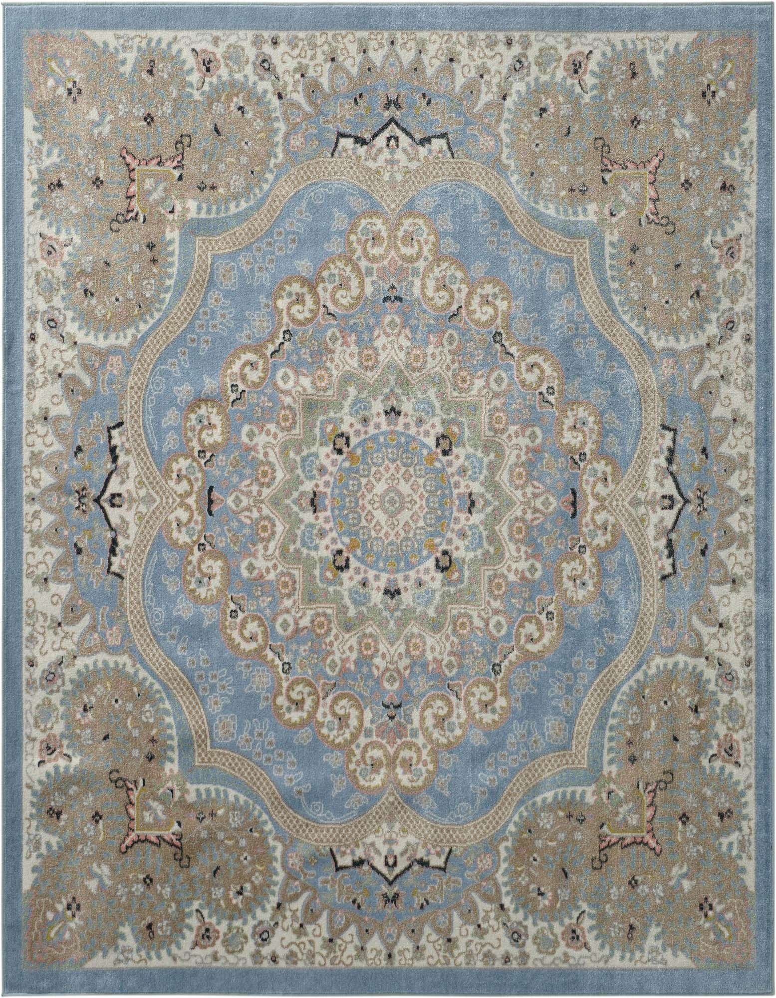 Primary color is Light Blue. Colors in this rug include: Light Blue, Beige, Ivory, Light Green, Pink.