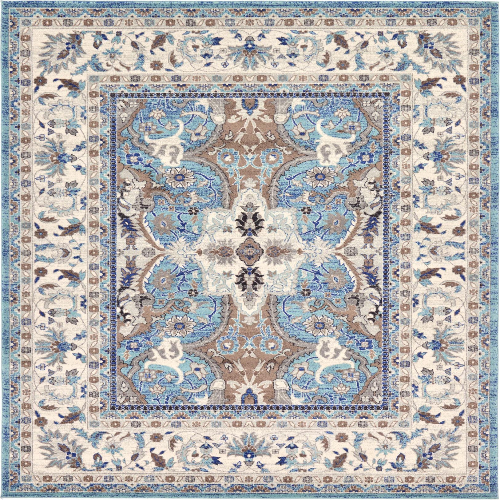 Primary color is Light Blue. Colors in this rug include: Light Blue, Black, Blue, Gray, Ivory.