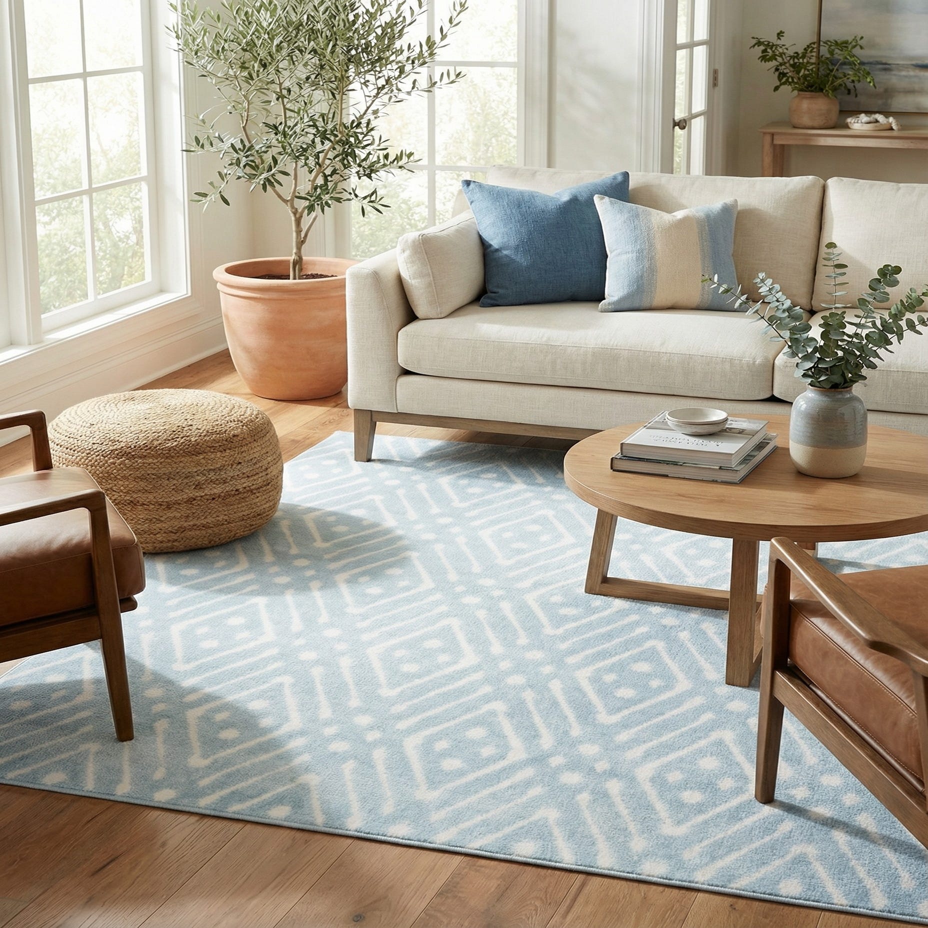 Primary color is Light Blue. Colors in this rug include: Light Blue, Ivory.