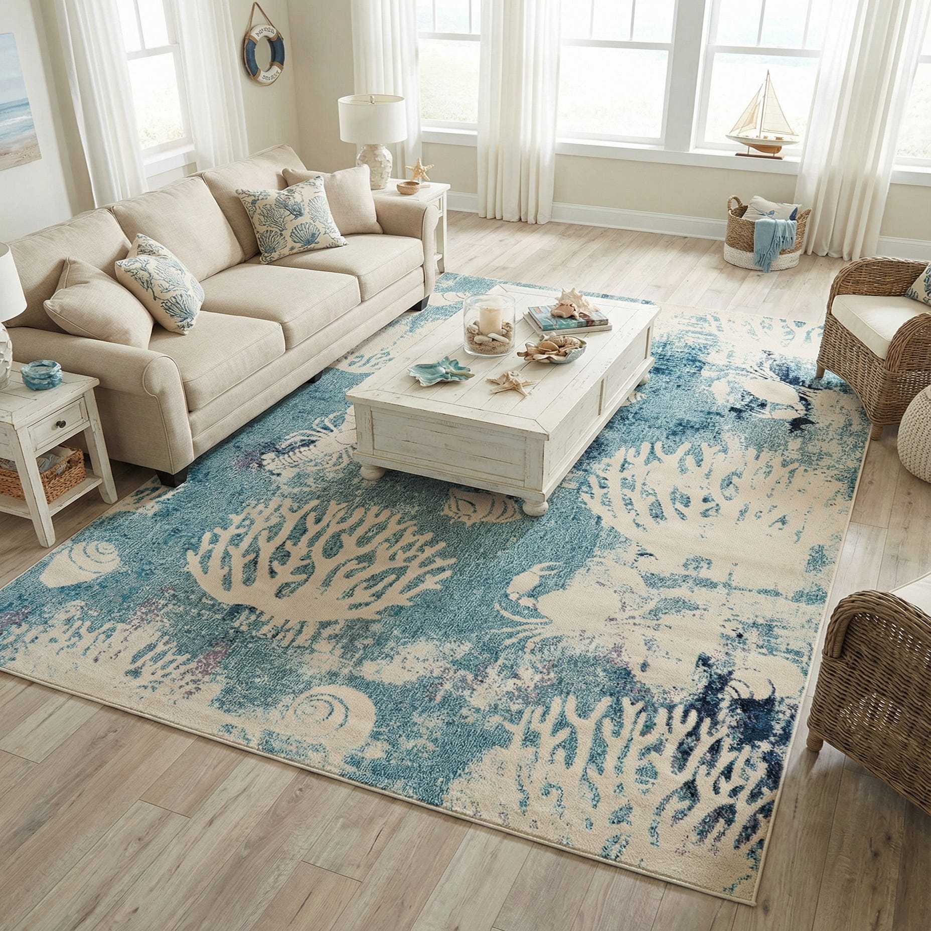 Primary color is Light Blue. Colors in this rug include: Light Blue, Beige, Navy Blue, Red.