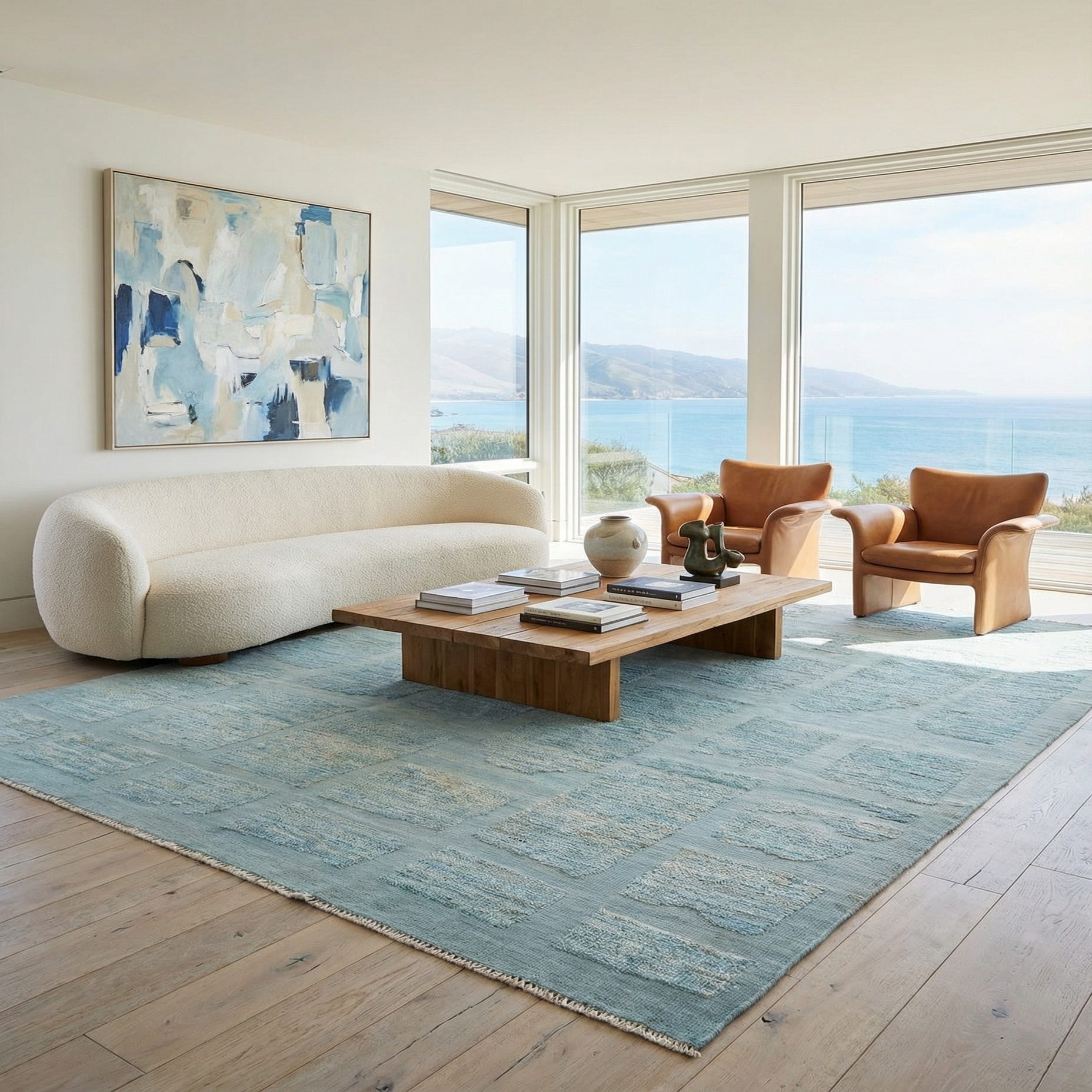 Primary color is Light Blue. Colors in this rug include: Light Blue, Beige.