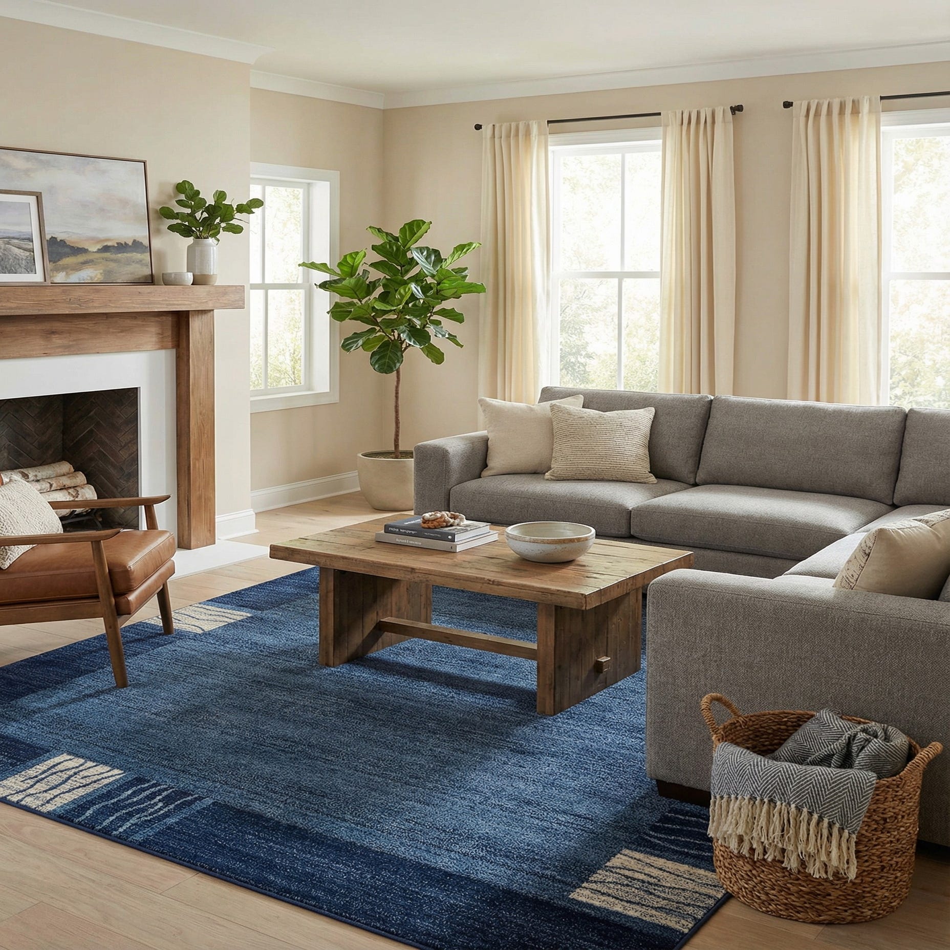 Primary color is Light Blue. Colors in this rug include: Light Blue, Blue, Navy Blue, Ivory.