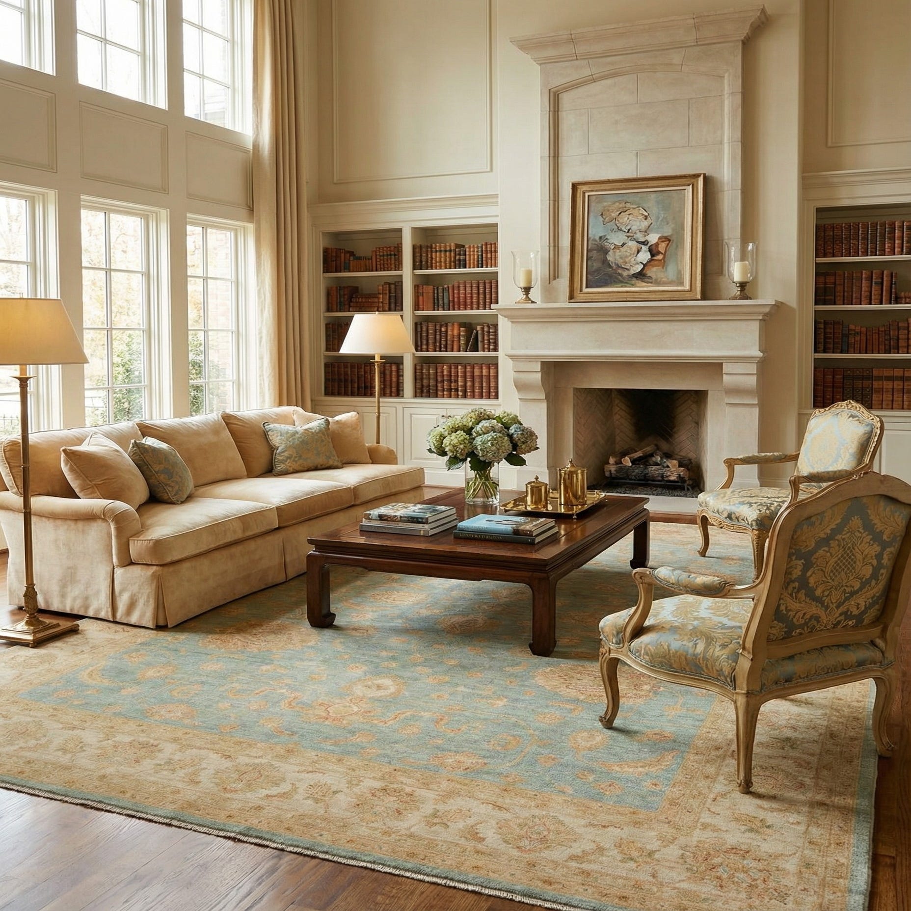 Primary color is Light Blue. Colors in this rug include: Light Blue, Light Blue, Cream, Beige, red.