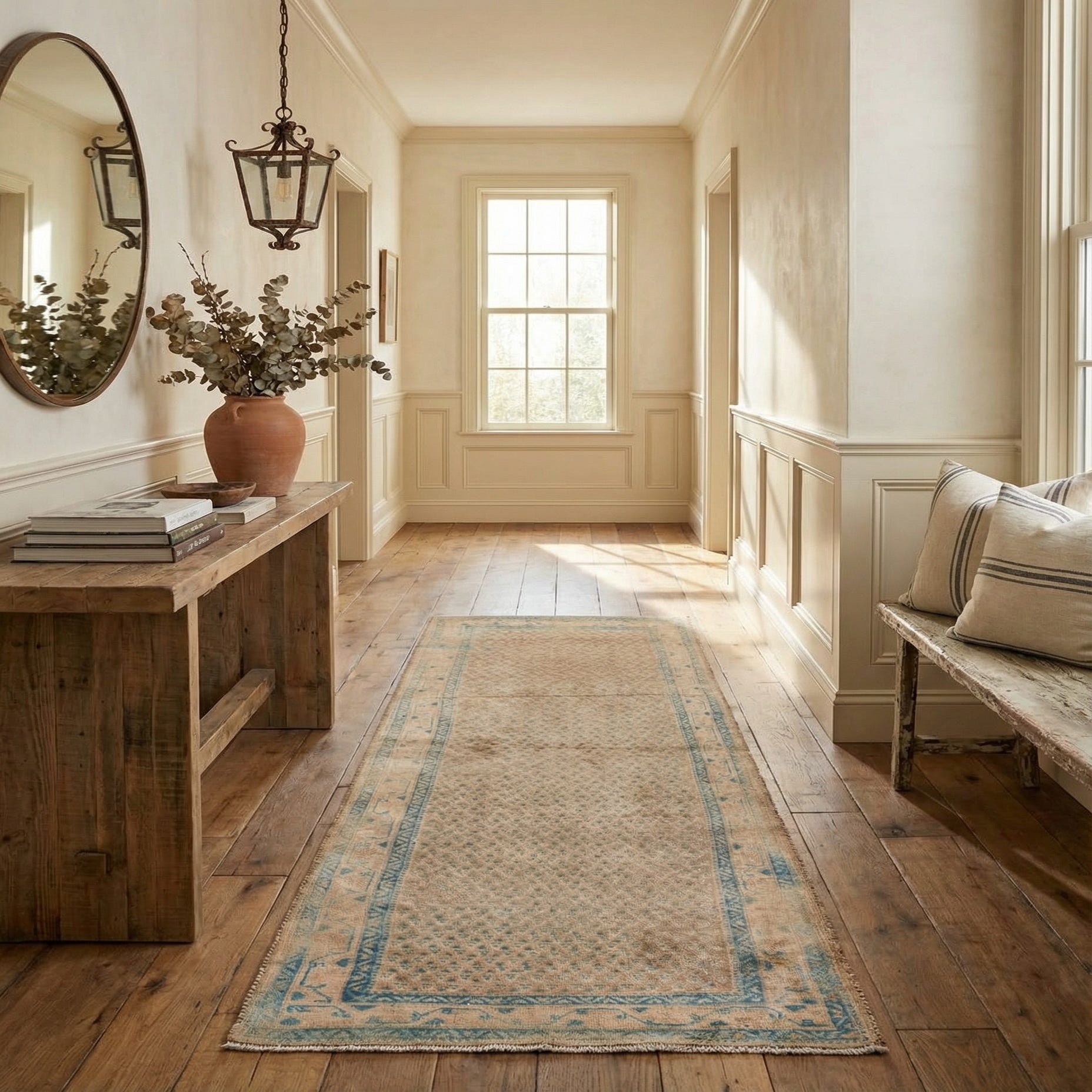 Primary color is Light Brown. Colors in this rug include: Light Brown, Blue, Ivory.