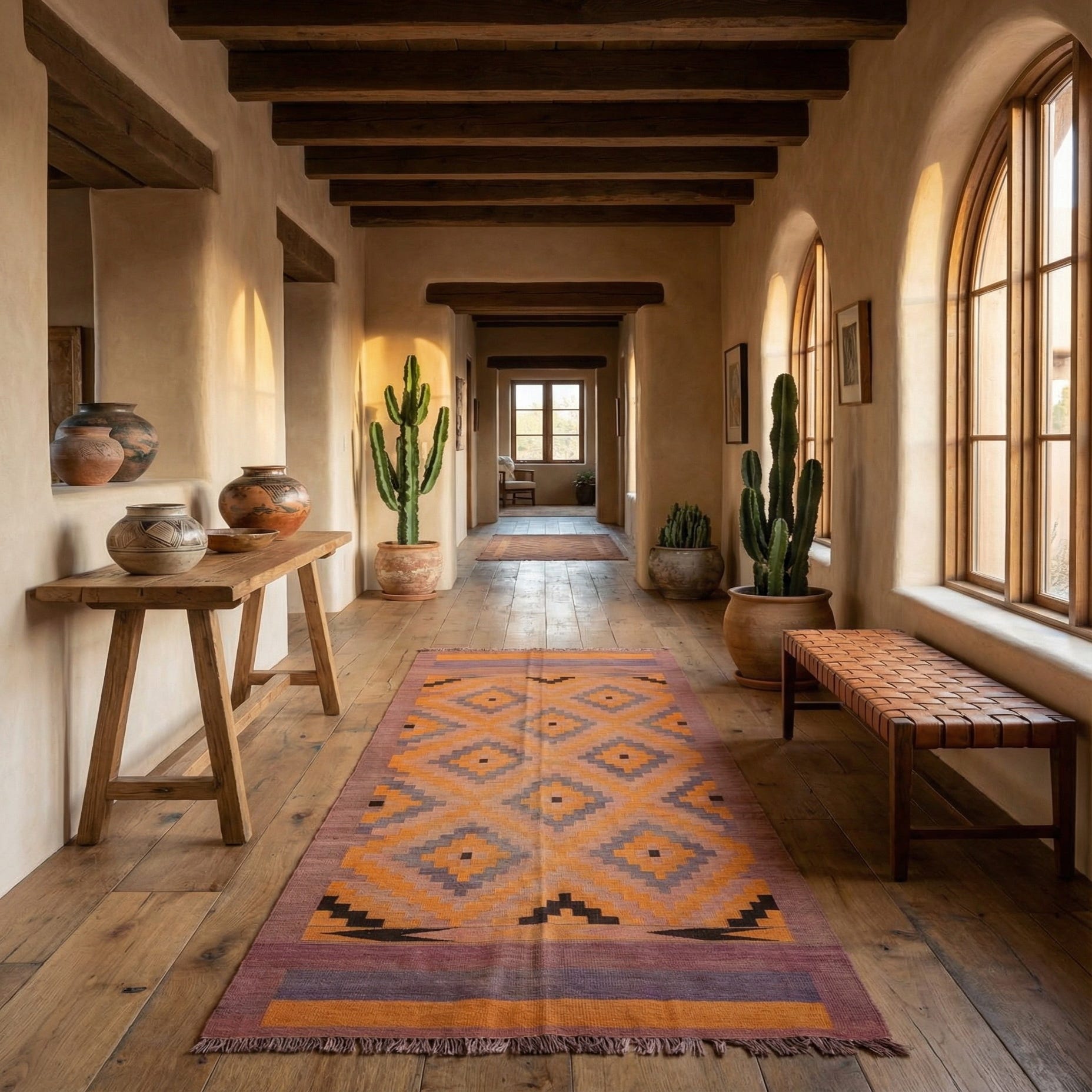 Primary color is Light Brown. Colors in this rug include: Light Brown, Brown, Orange, Purple.