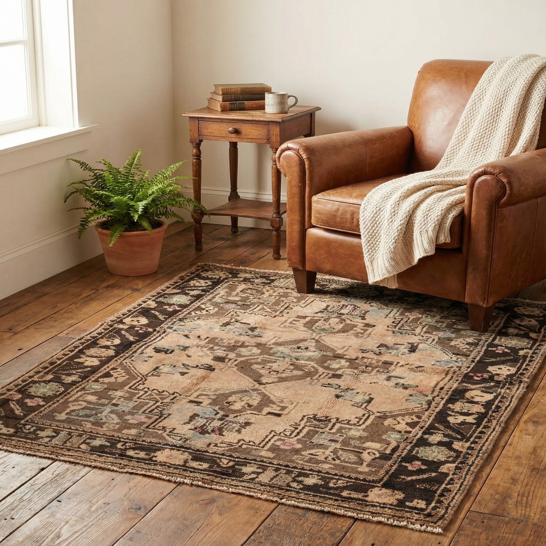 Primary color is Light Brown. Colors in this rug include: Light Brown, Brown, Rust Red, Beige.