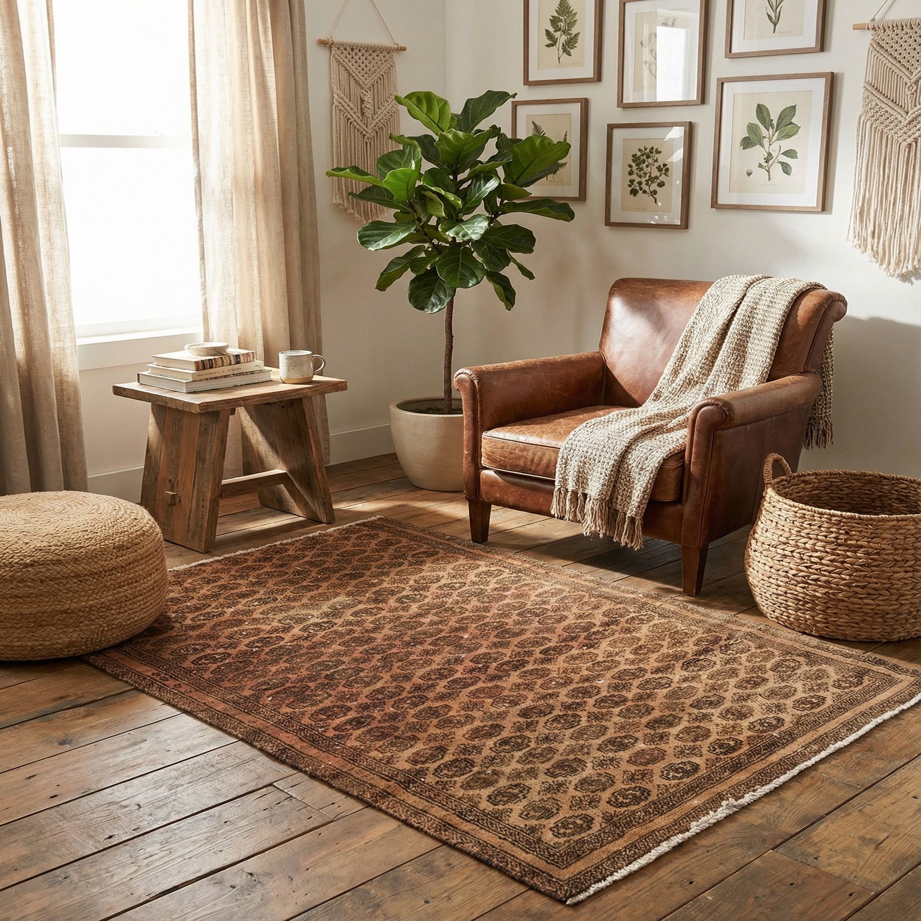Primary color is Light Brown. Colors in this rug include: Light Brown, Brown, Rust Red.