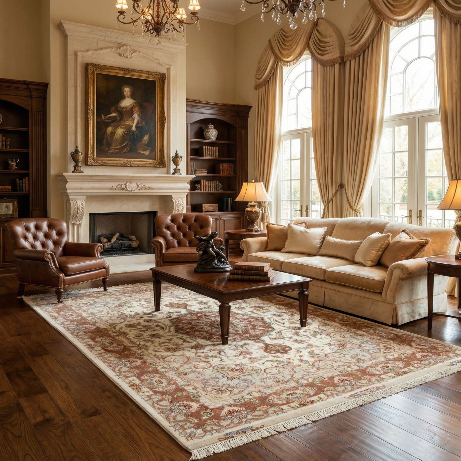 Primary color is Light Brown. Colors in this rug include: Light Brown, Light Brown, Beige, Cream, Orange, Olive, Blue, Red, Pink.