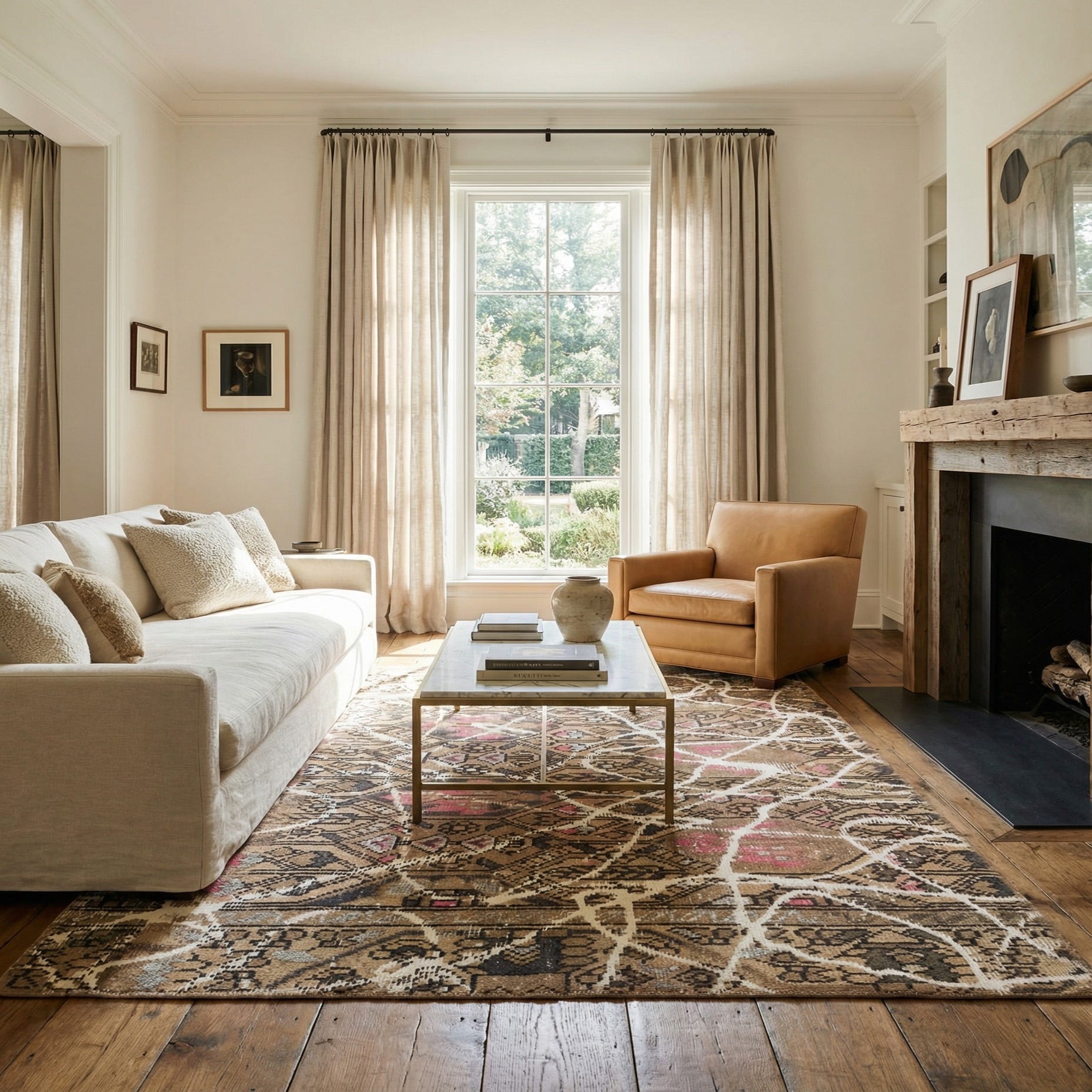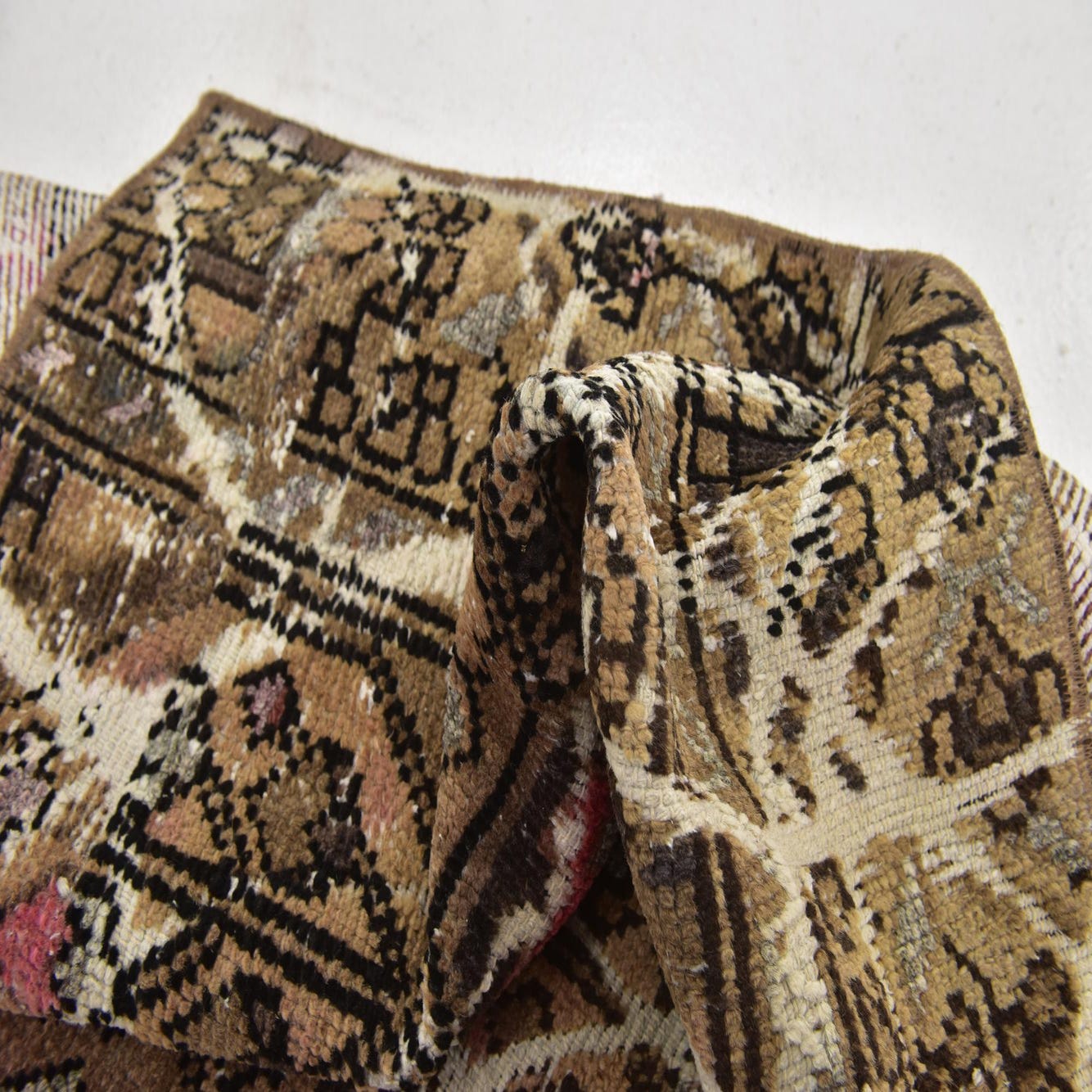 Primary color is Light Brown. Colors in this rug include: Light Brown, Brown, Ivory, Rust Red, Pink, Tan.