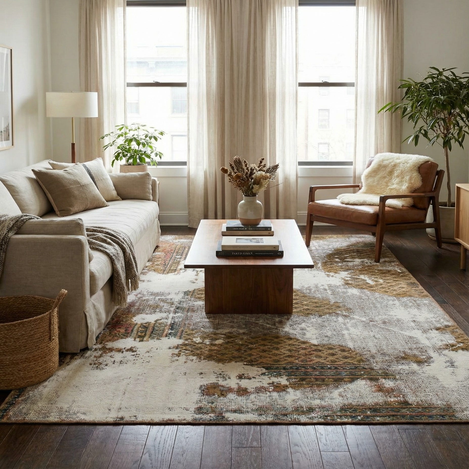 Primary color is Light Brown. Colors in this rug include: Light Brown, Brown, Green, Olive, Puce, Rust Red, Ivory.