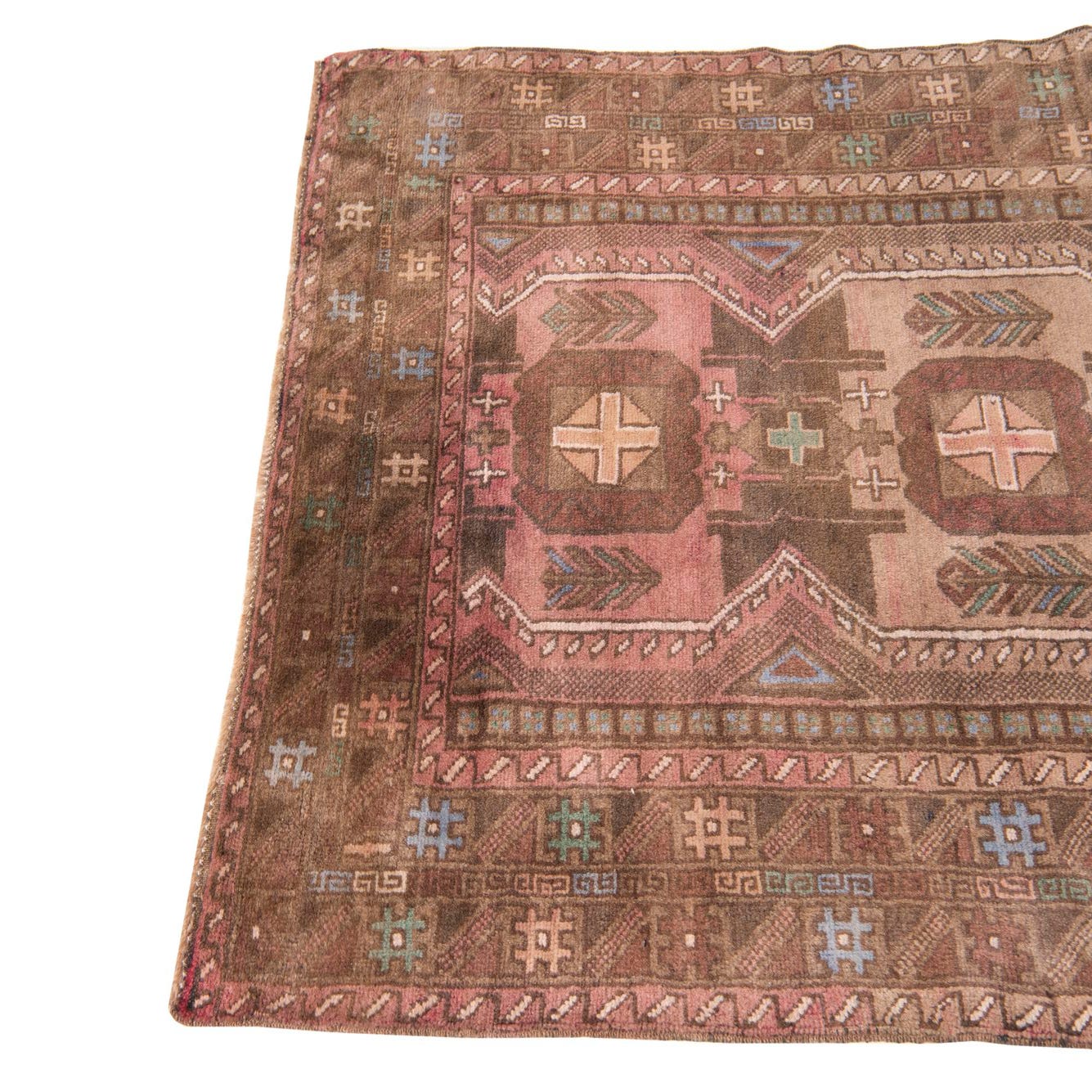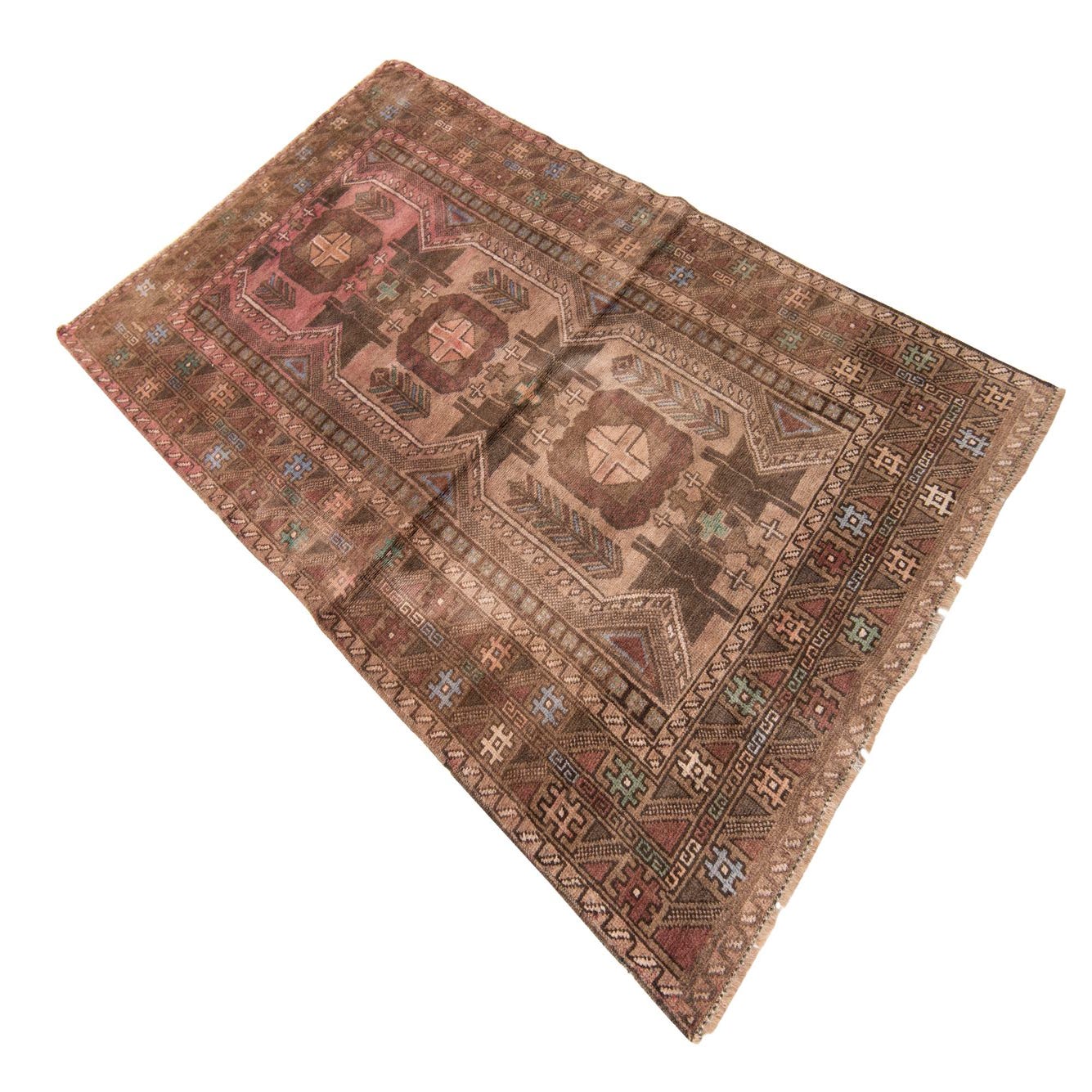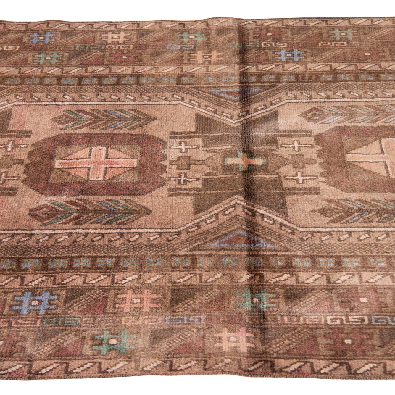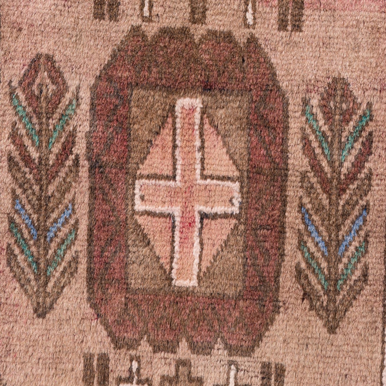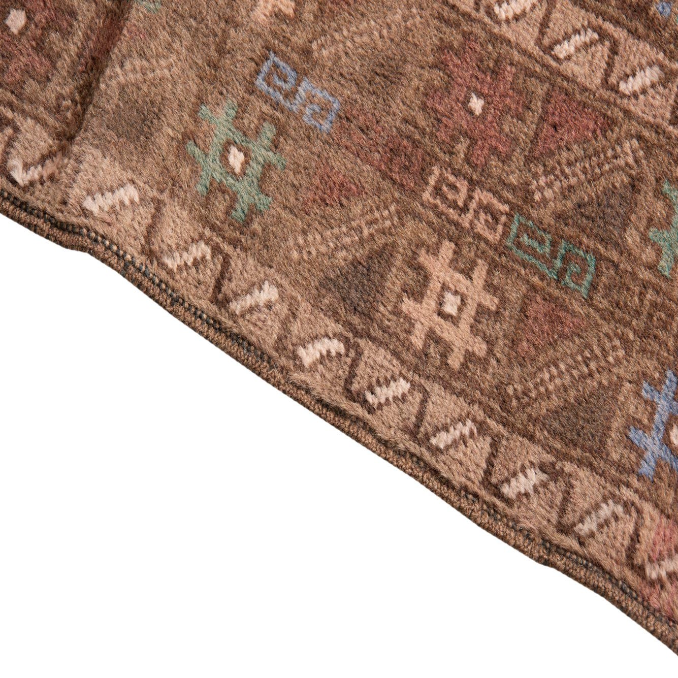 Primary color is Light Brown. Colors in this rug include: Light Brown, Brown, Green, Rust Red.